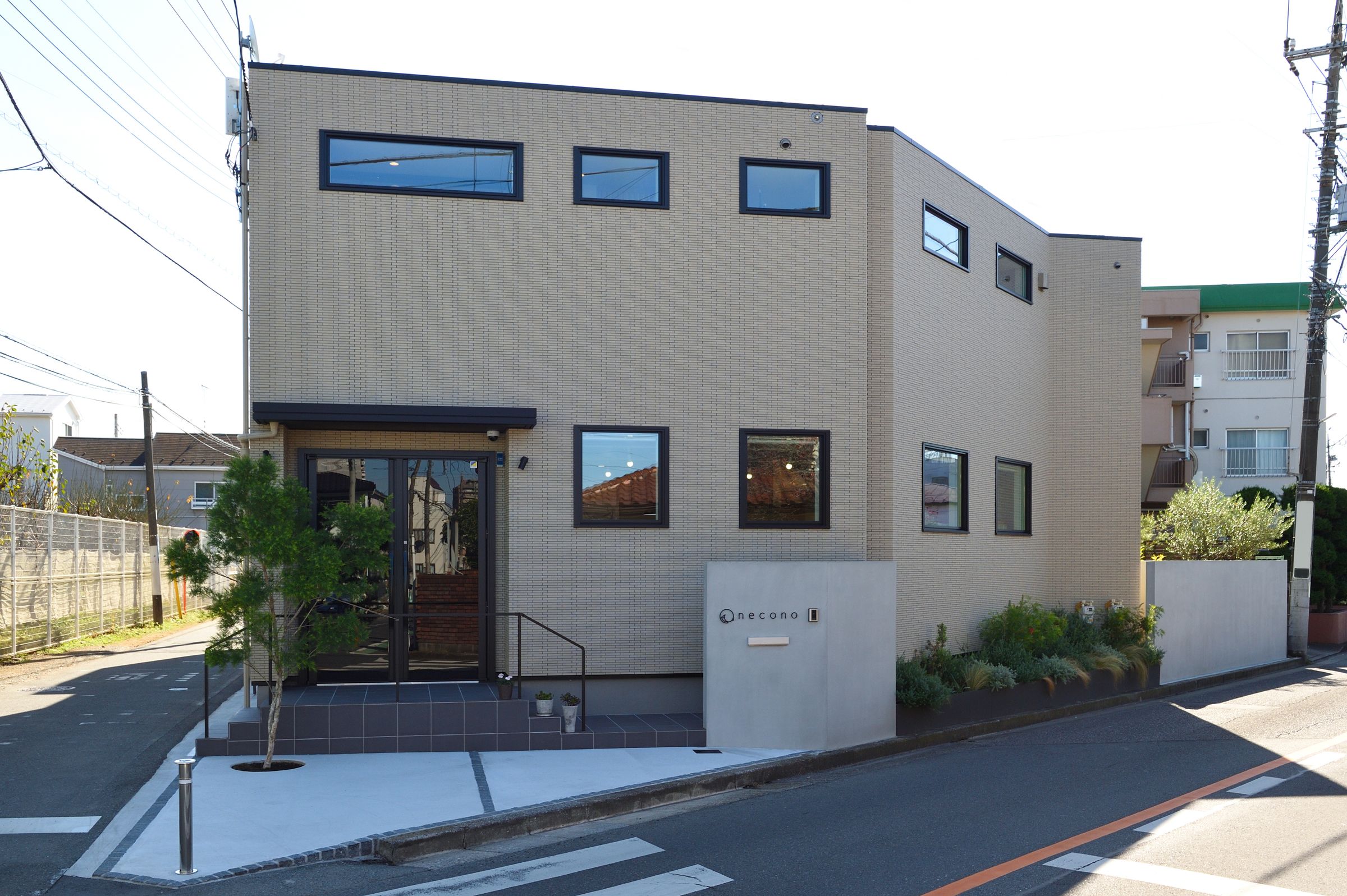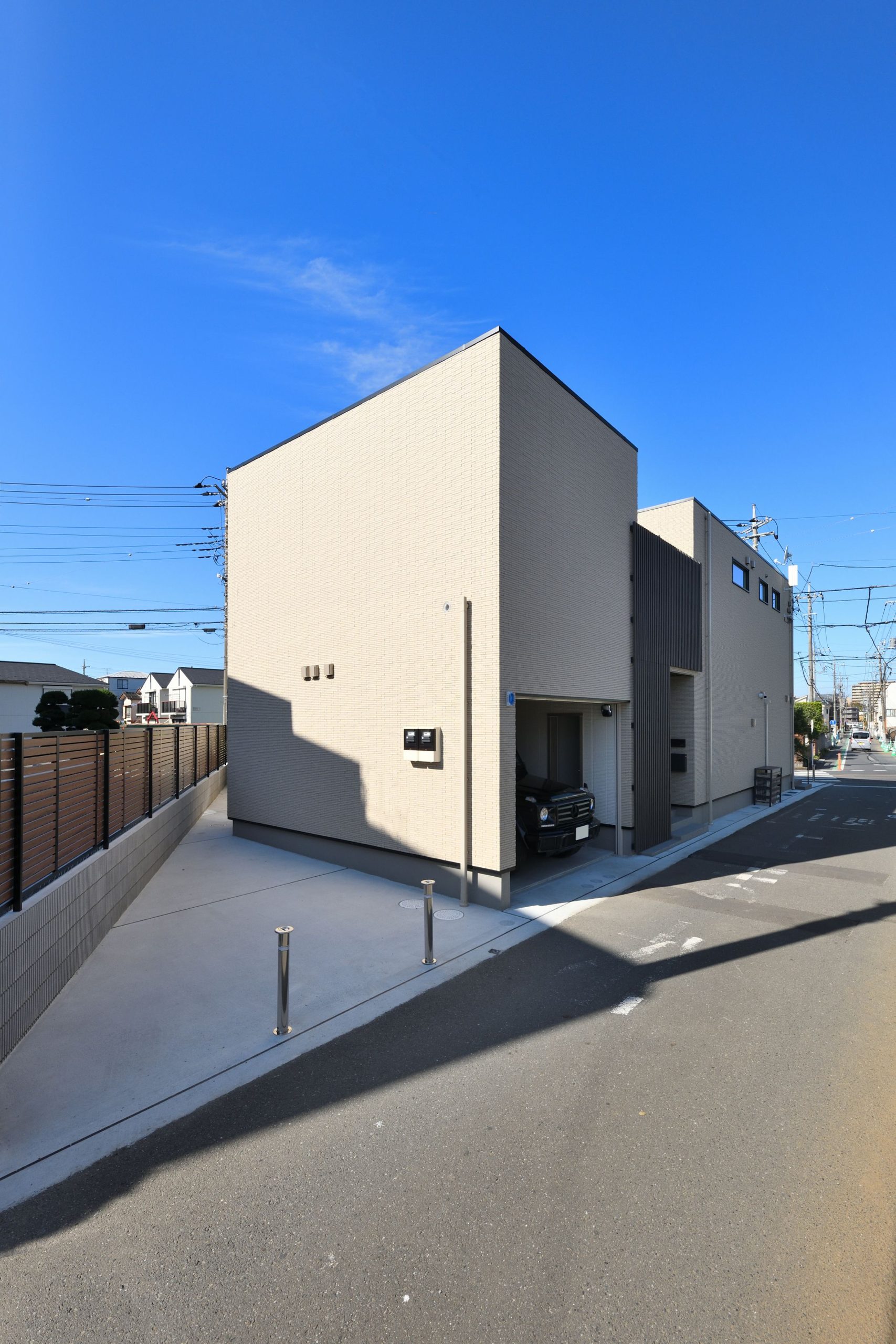 三角形状の敷地に佇むインナーガレージ付事務所併用二世帯住宅。敷地形状に合わせて斜めのカットウォールが印象的な総タイルの上品な外観