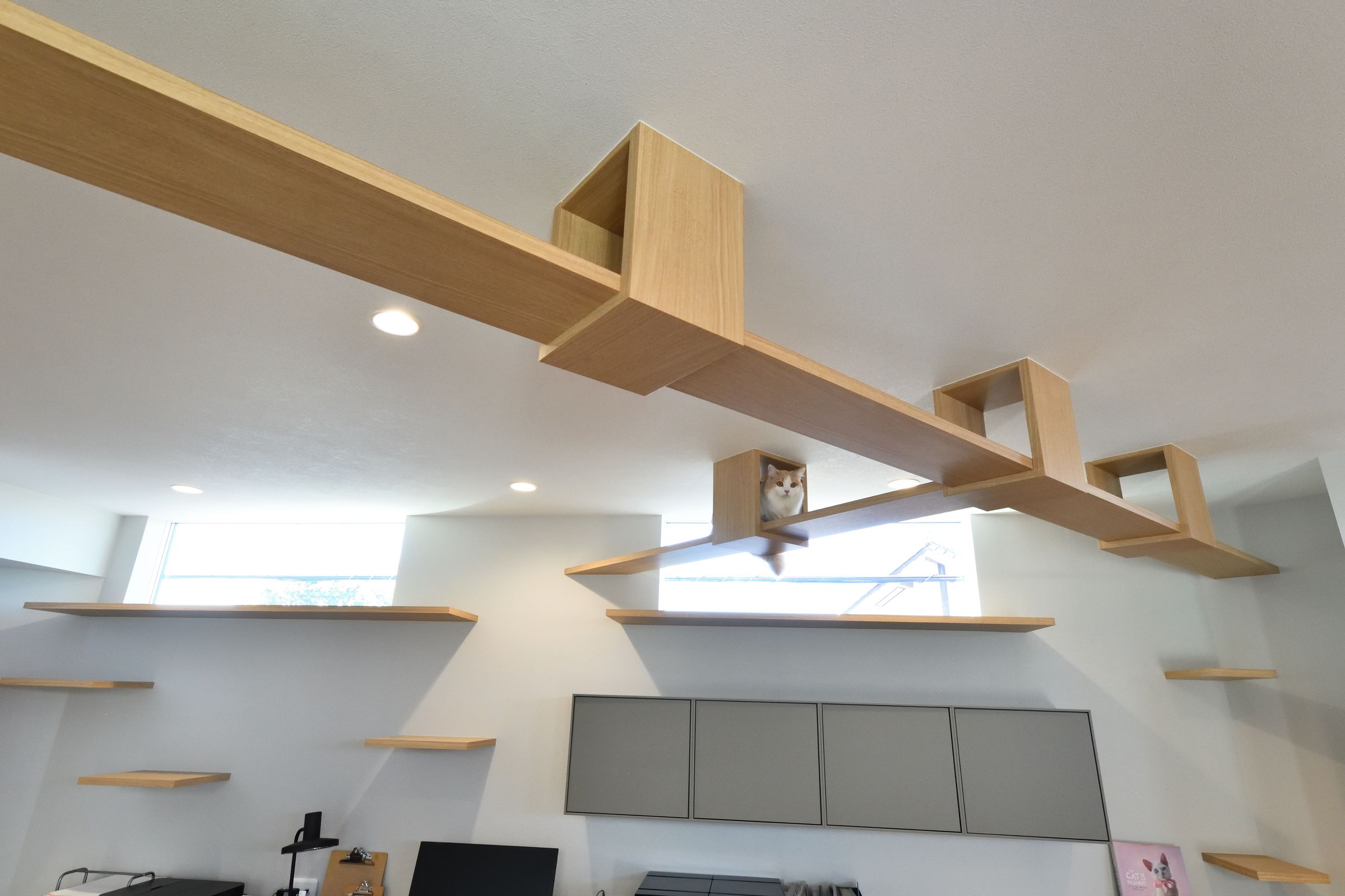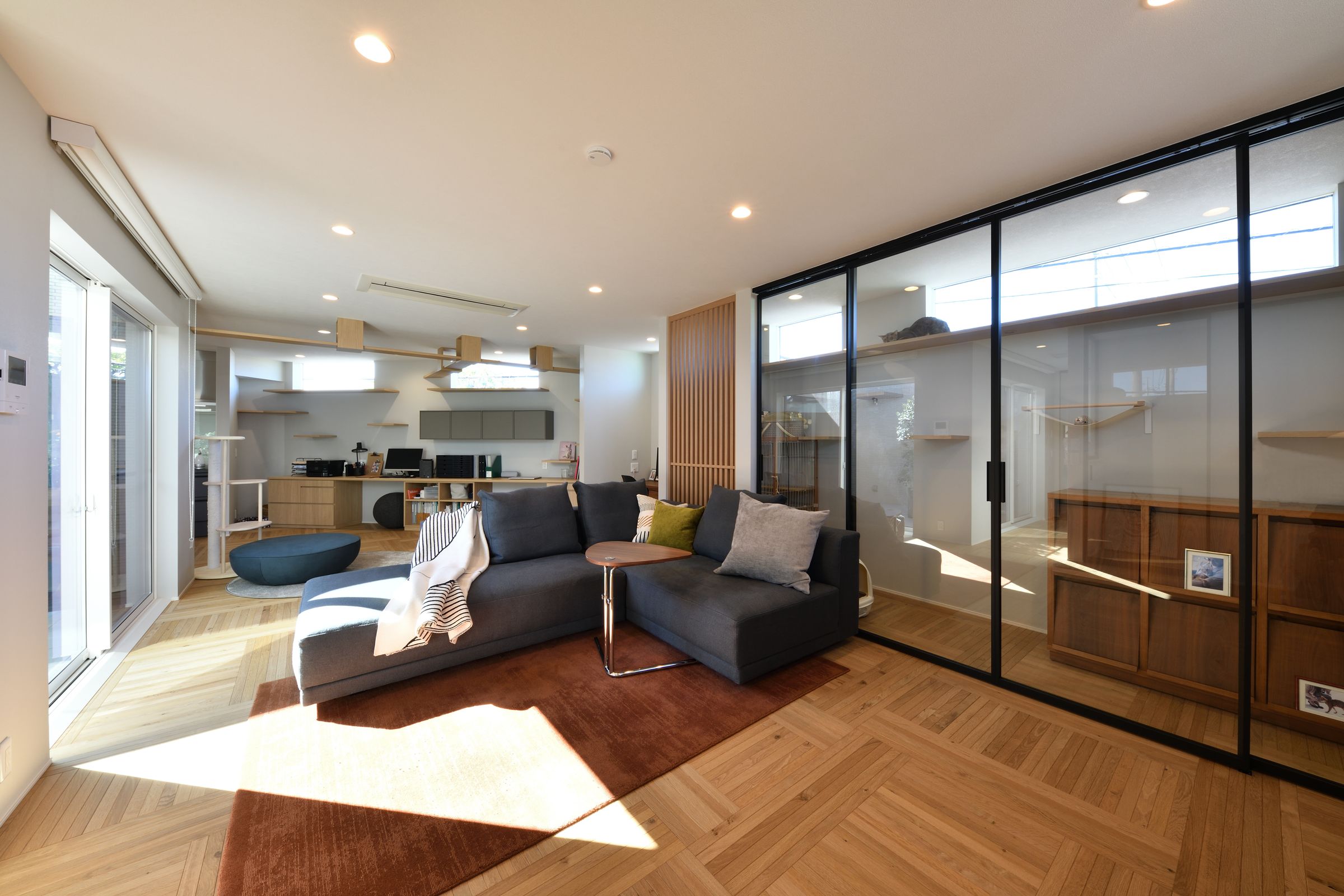 飼い主と猫とお互いの姿が見えるようにガラスドアにするなど、愛猫がストレスなく自由に心地よく暮らせる猫目線での工夫が盛りだくさん