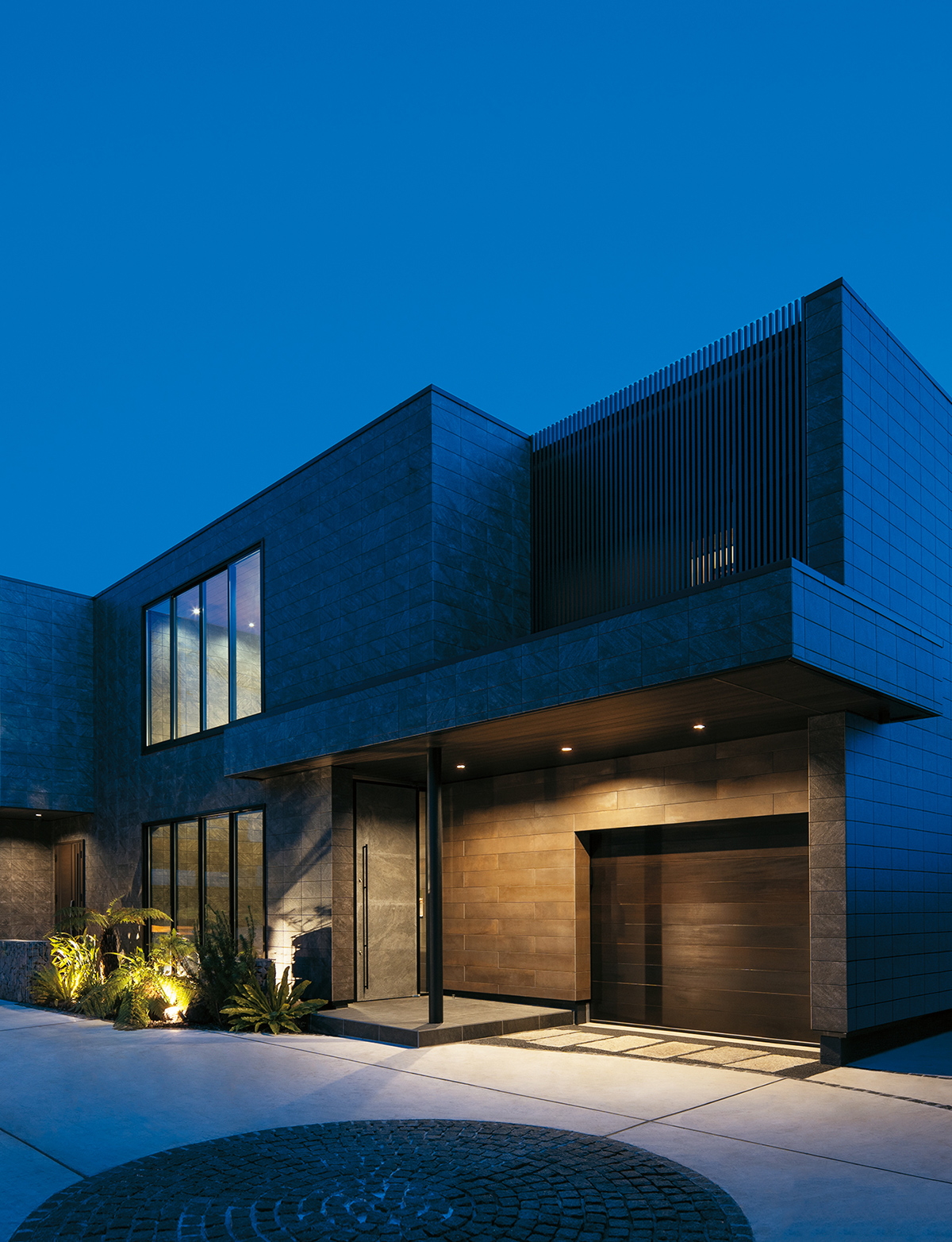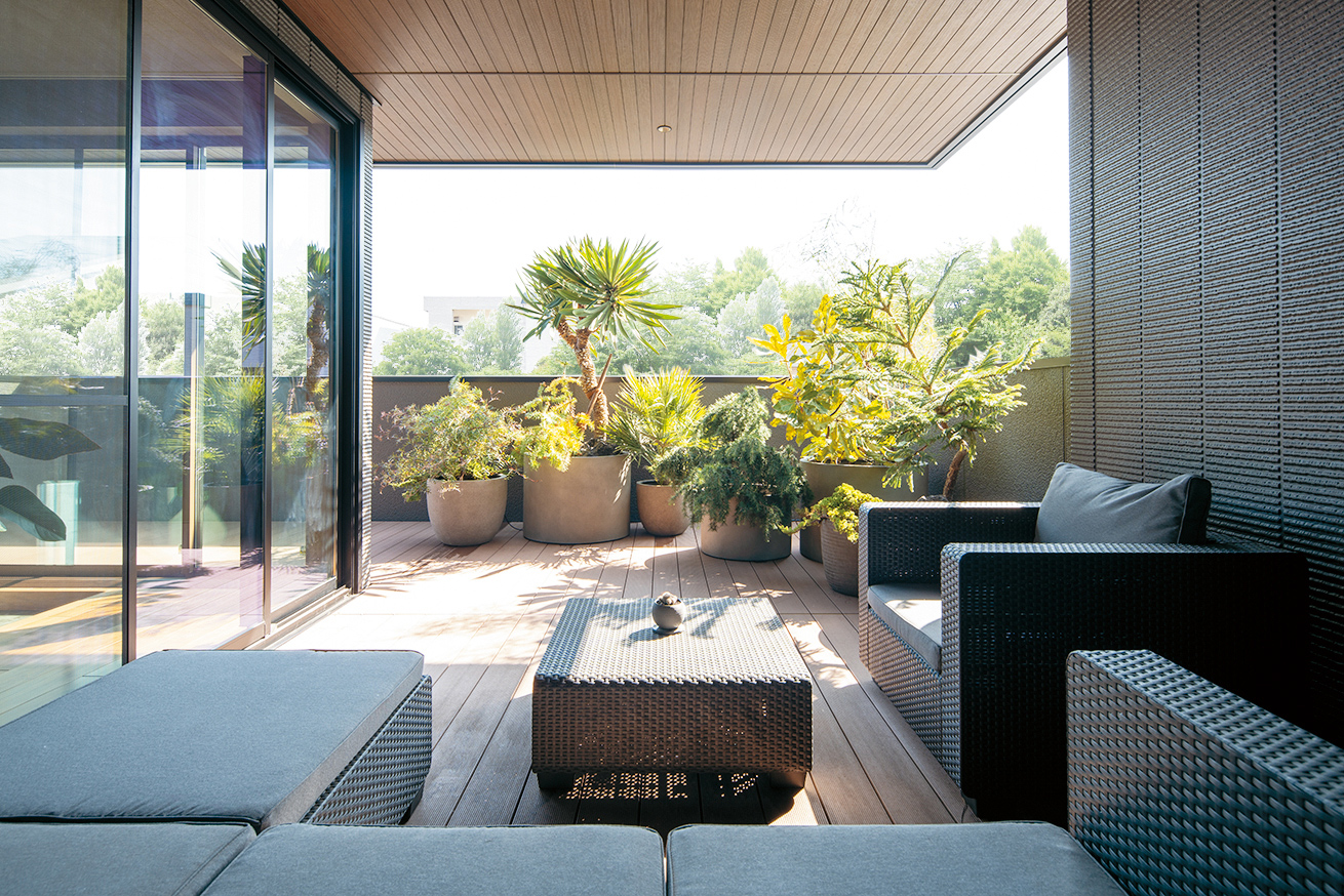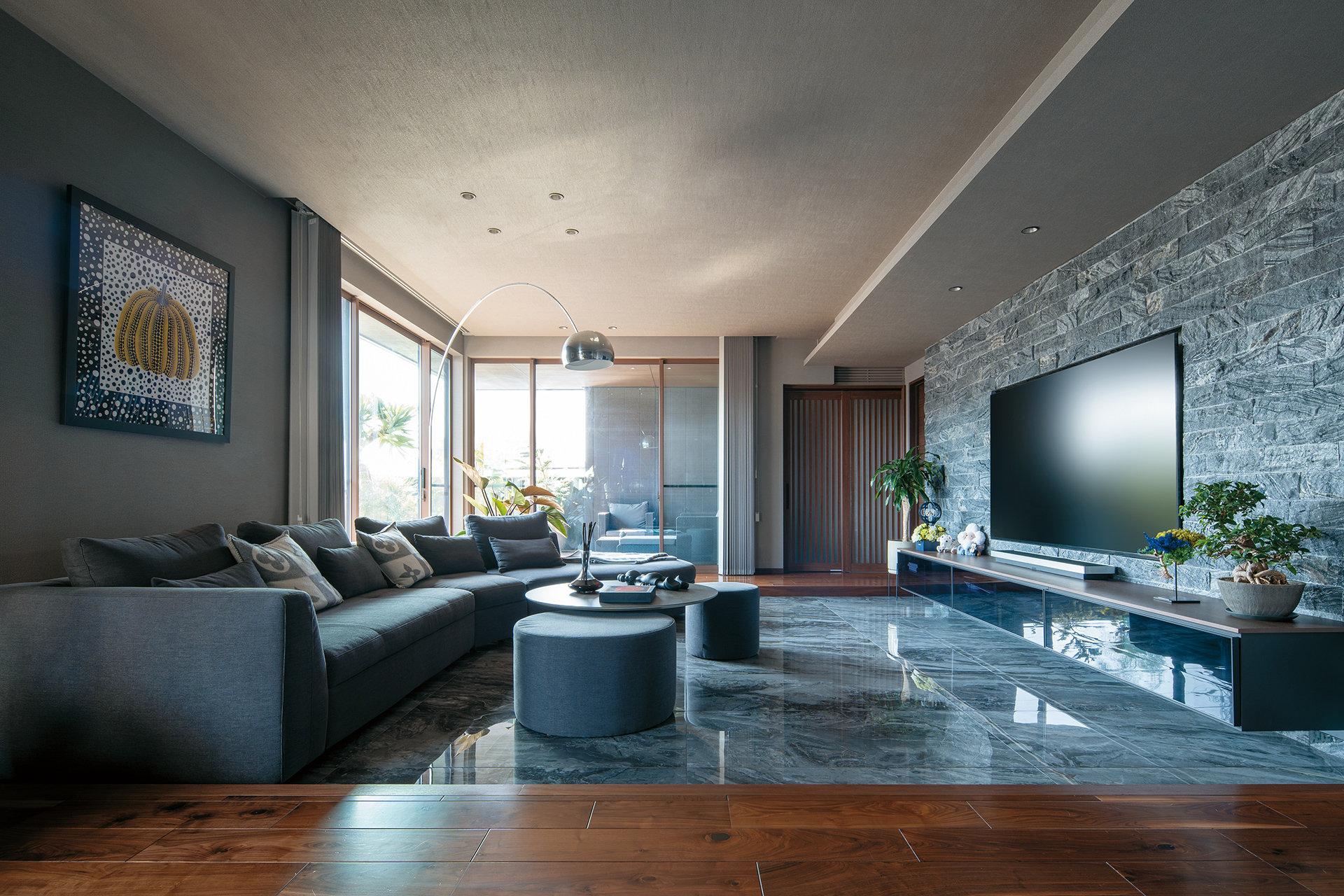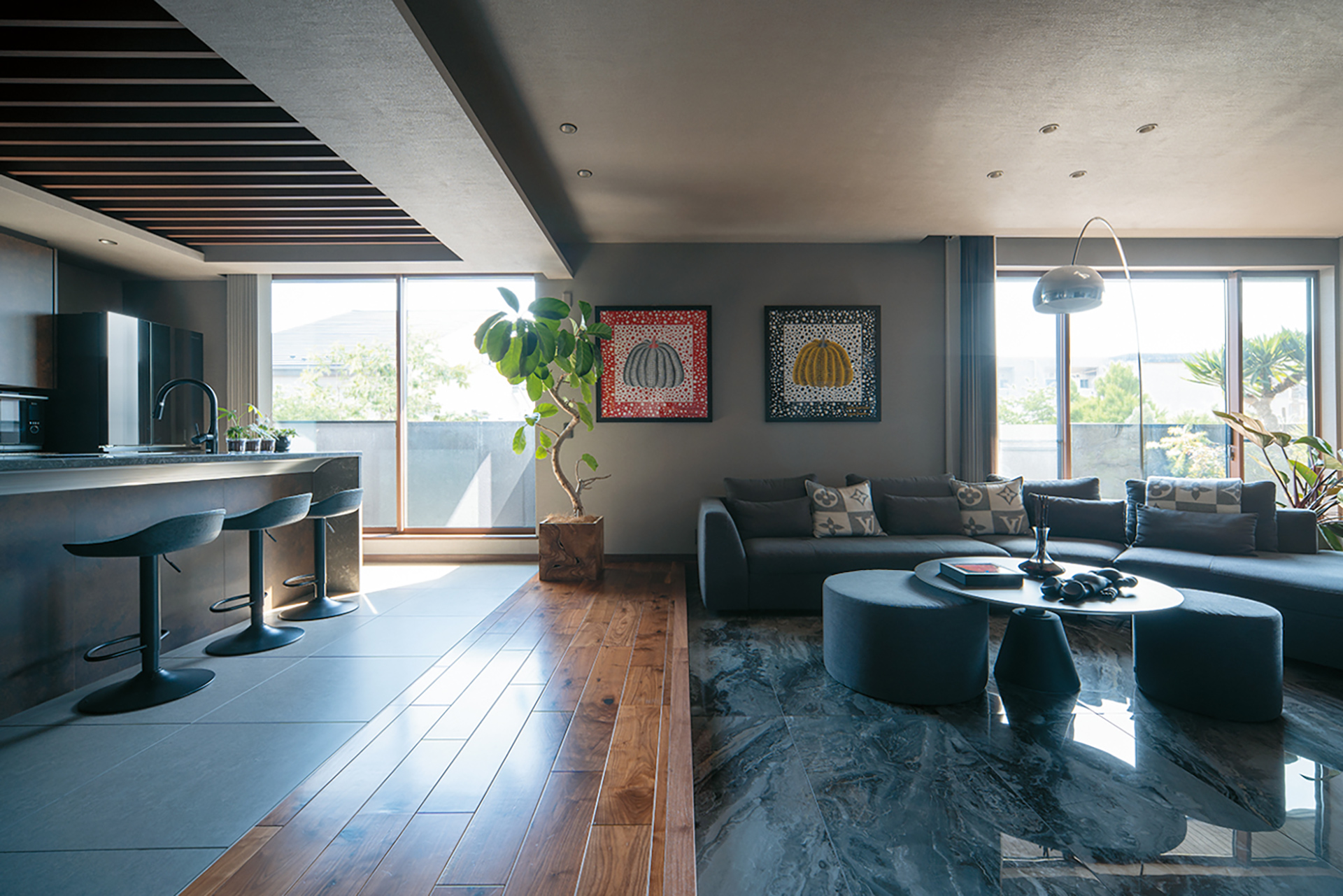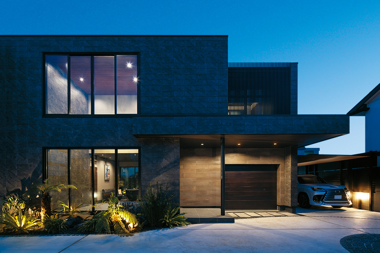 縦横の広がりが贅沢な開放感をもたらす事務所併用の2階建邸宅。2階LDKは木の深みと重厚感あるタイルが醸し出す落ち着きをまとい、現代アートや照明などこだわりのインテリアにも個性が光る
