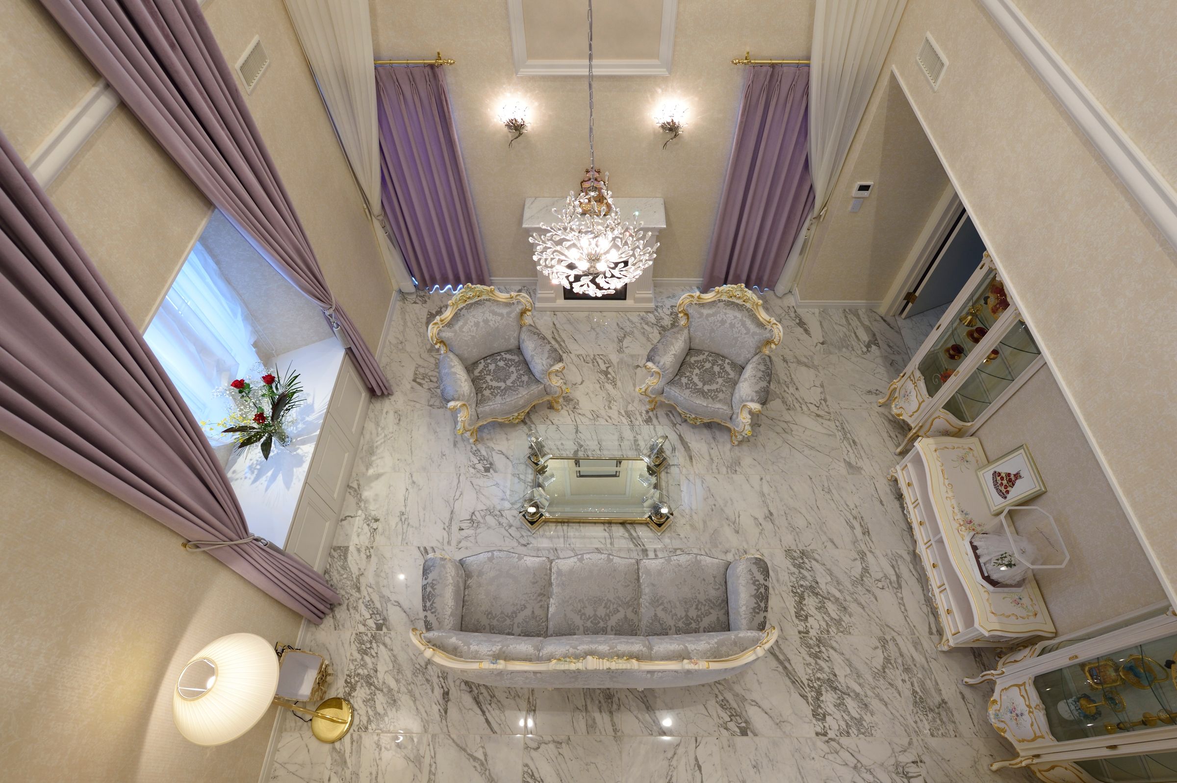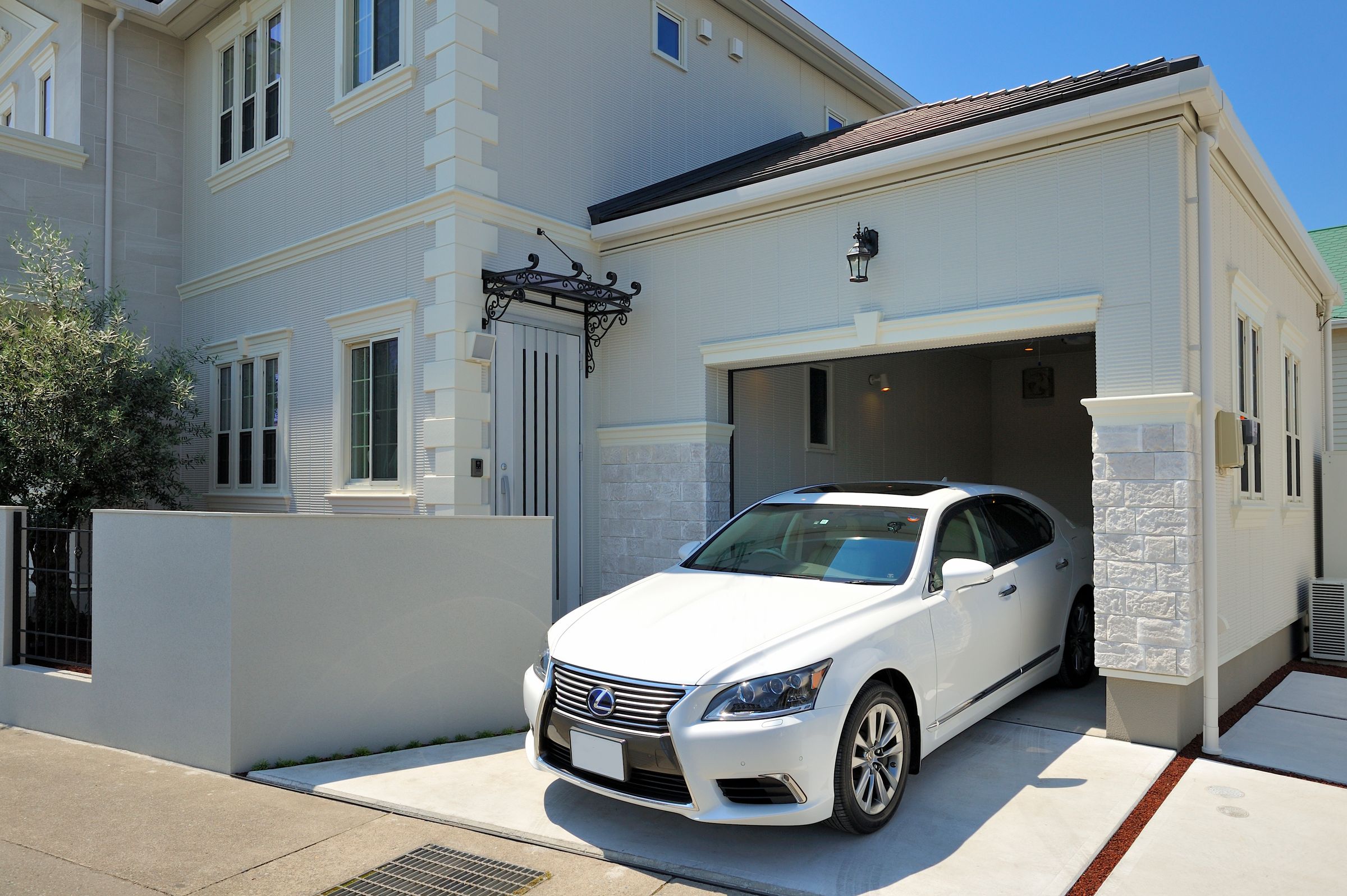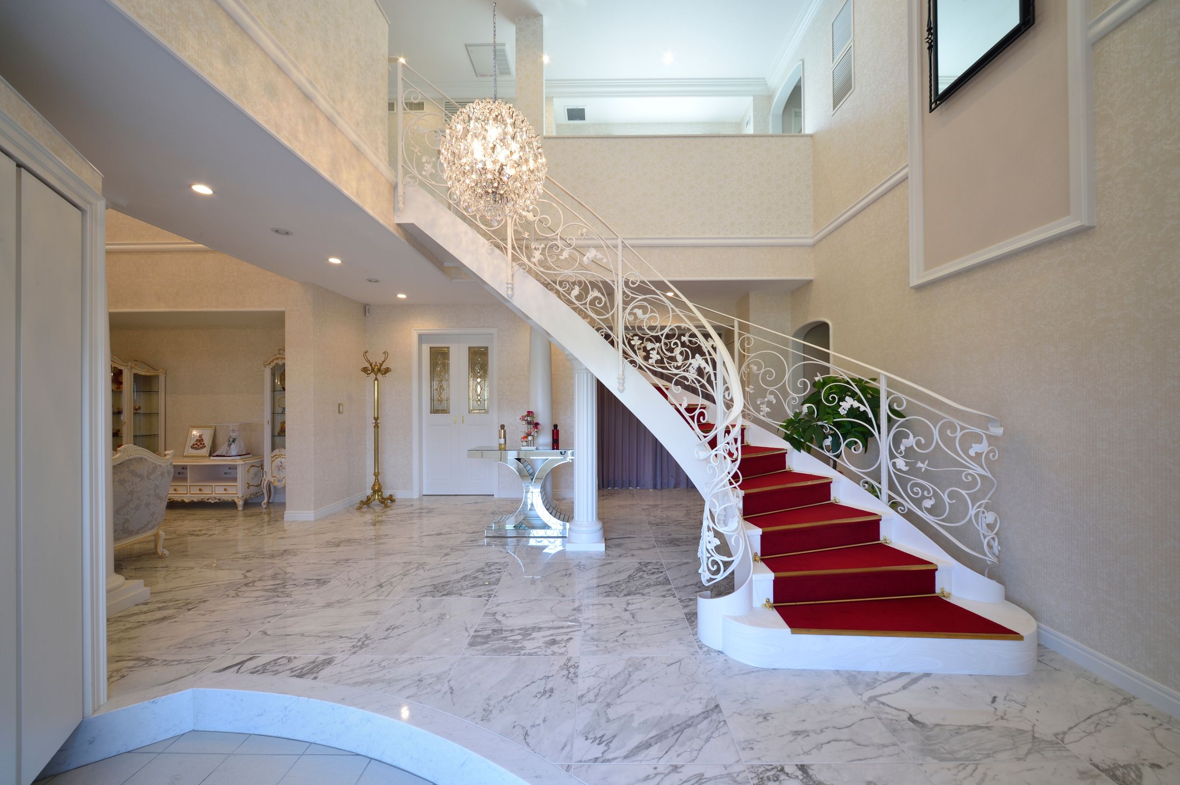 家全体をヨーロピアン調で統一したエレガントな雰囲気の邸宅。外観や外構はシンメトリーを意識し、白を基調とした設計に。中に入ると大型シャンデリアやレッドカーペットつきの階段がお出迎え。