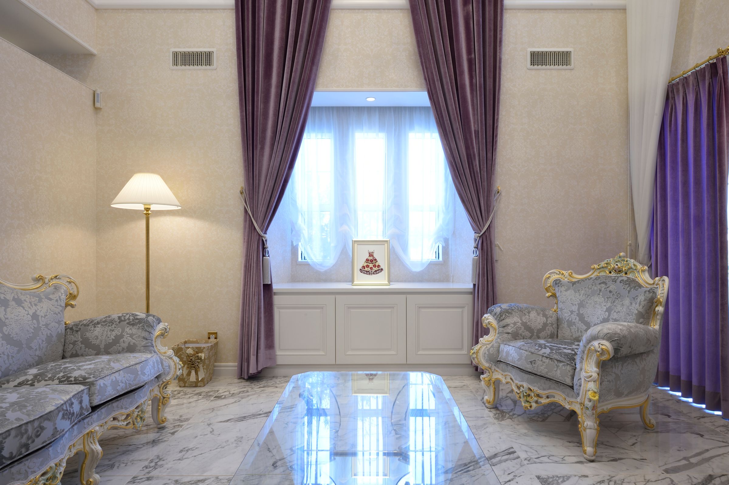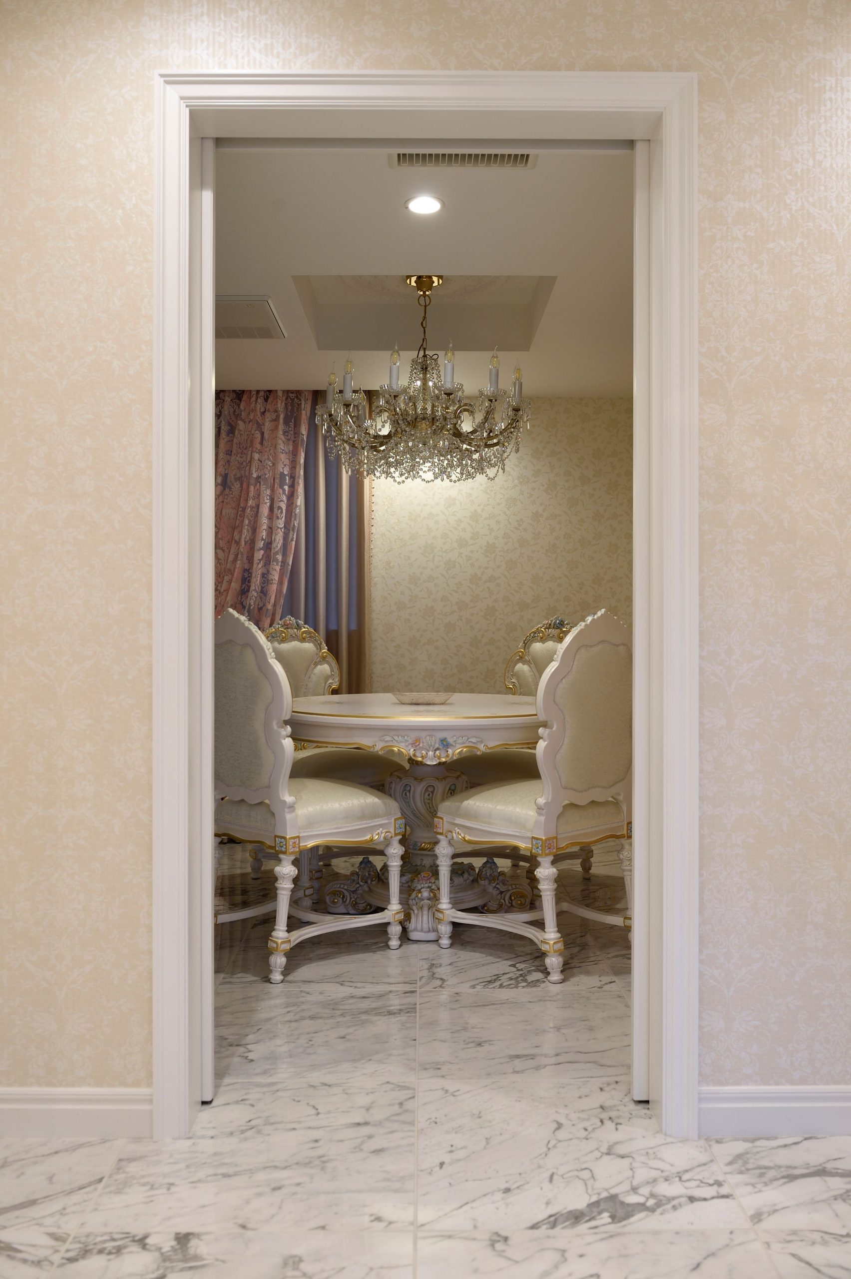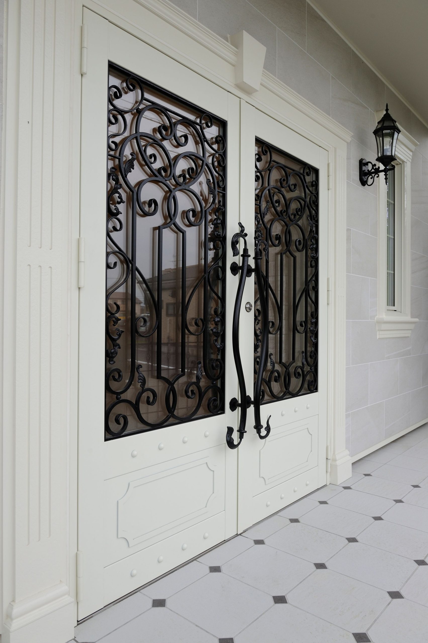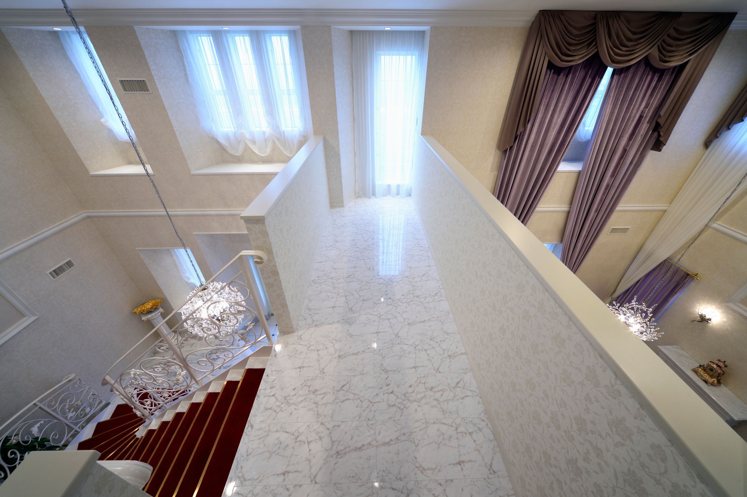 家全体をヨーロピアン調で統一したエレガントな雰囲気の邸宅。外観や外構はシンメトリーを意識し、白を基調とした設計に。中に入ると大型シャンデリアやレッドカーペットつきの階段がお出迎え。