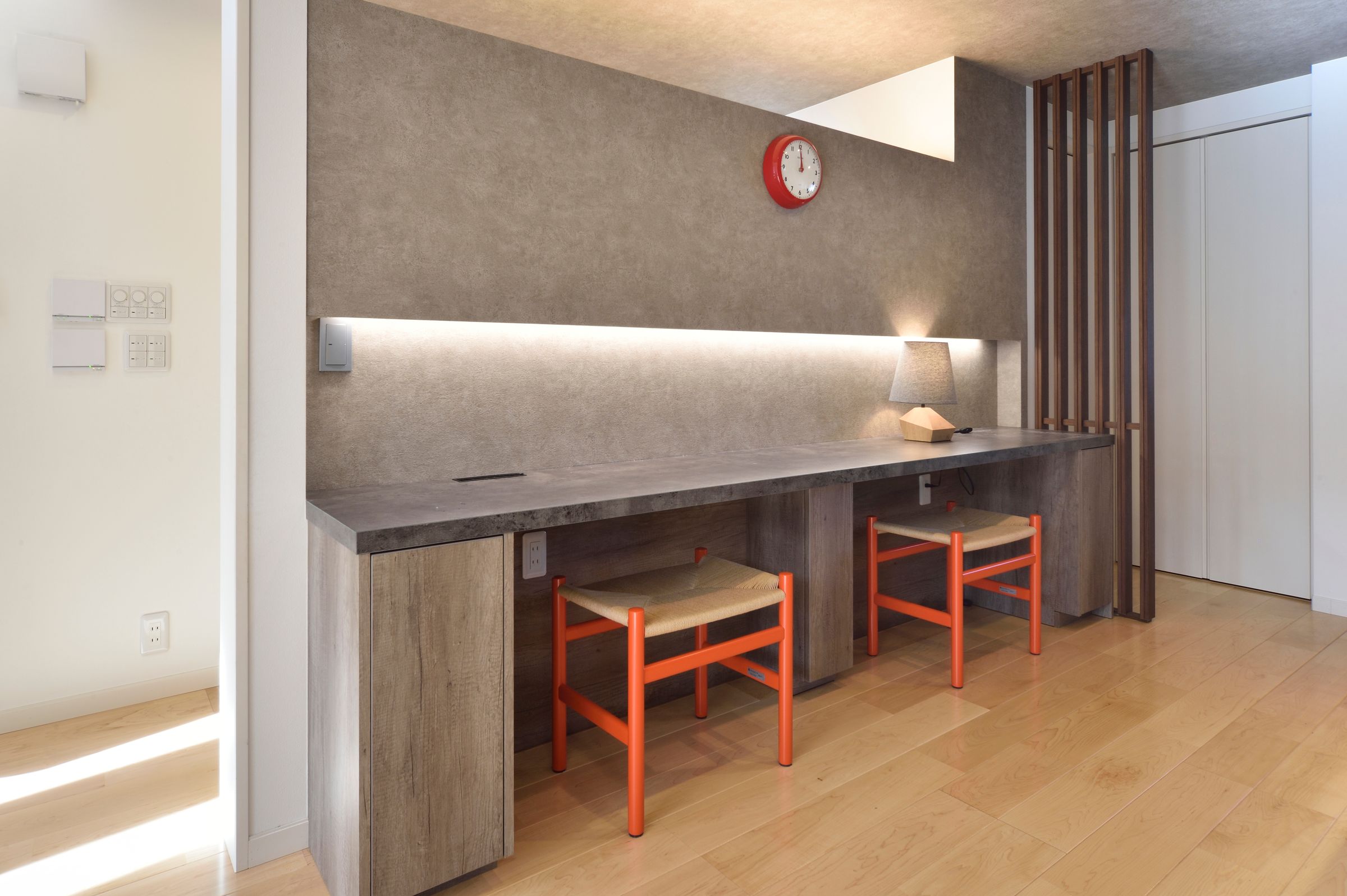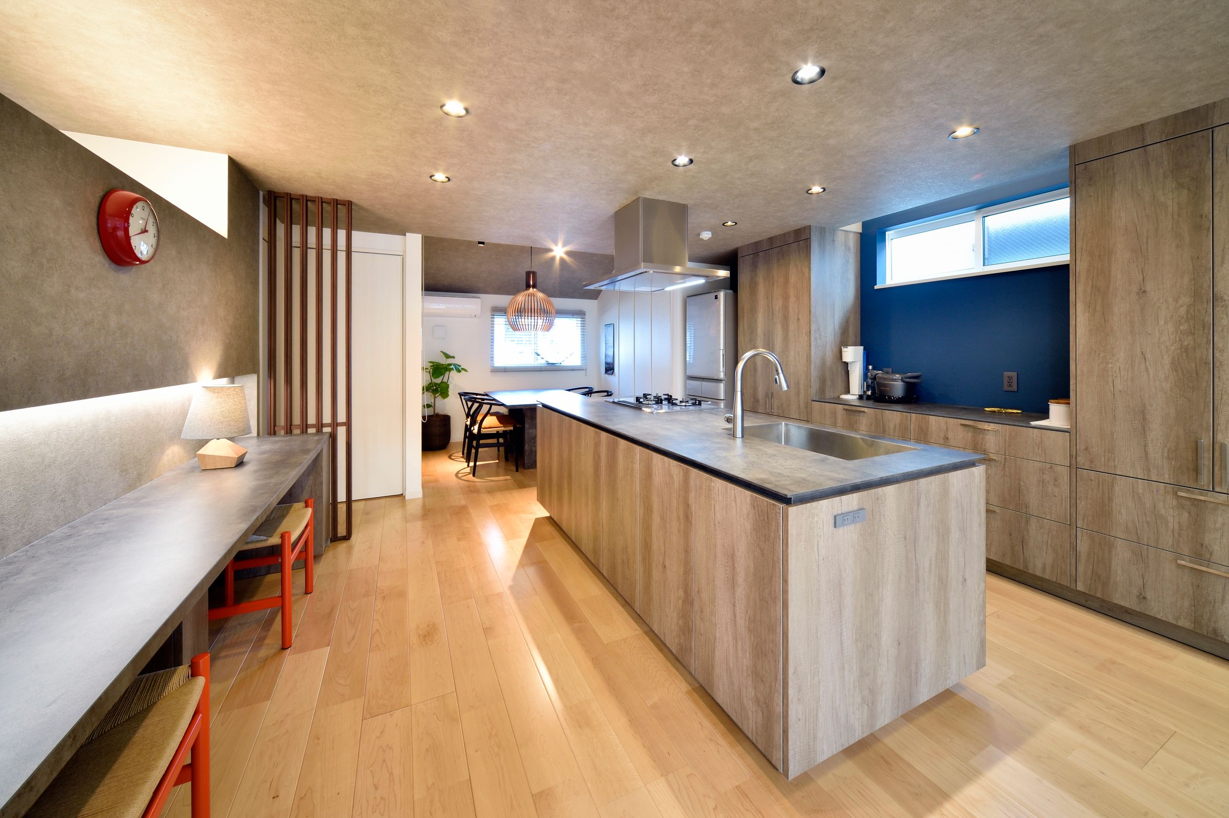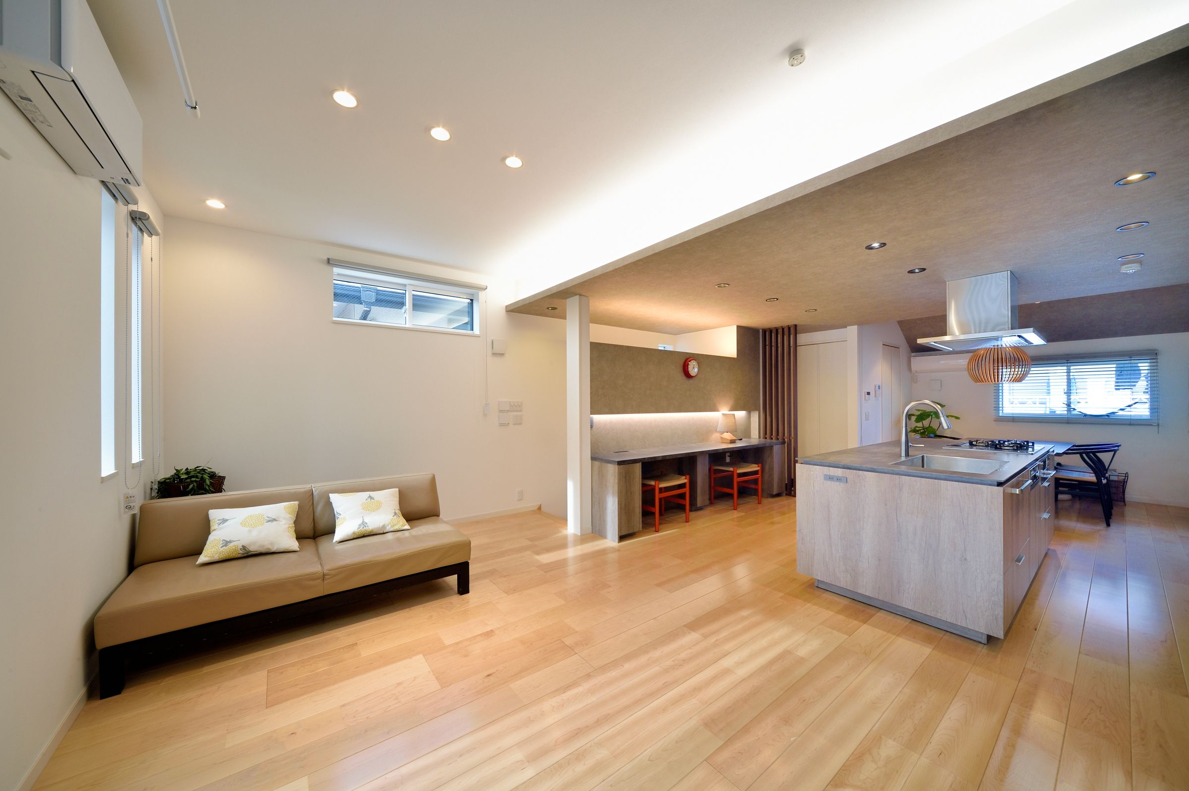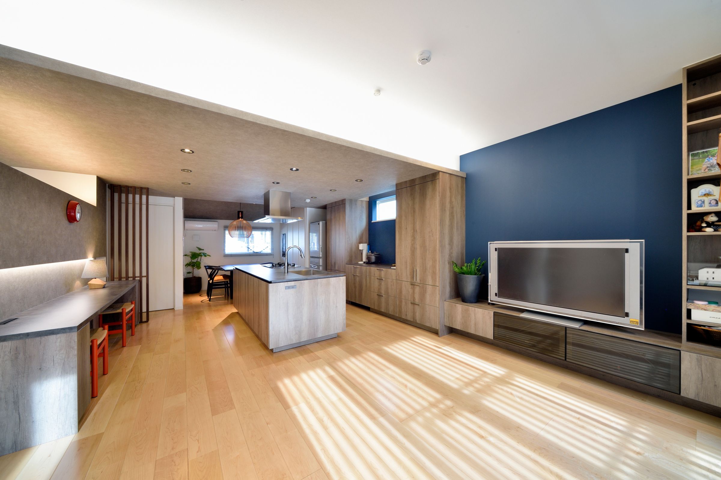大空間の中心に配置したオープンなアイランドキッチンが目を引く広くて明るいリビング。休日は家族そろって料理を楽しみ、心身ともにリフレッシュ。お子様が姉妹そろって勉強できるよう机も備え付け。夜はご主人様や奥様のワークスペースに早変わり。