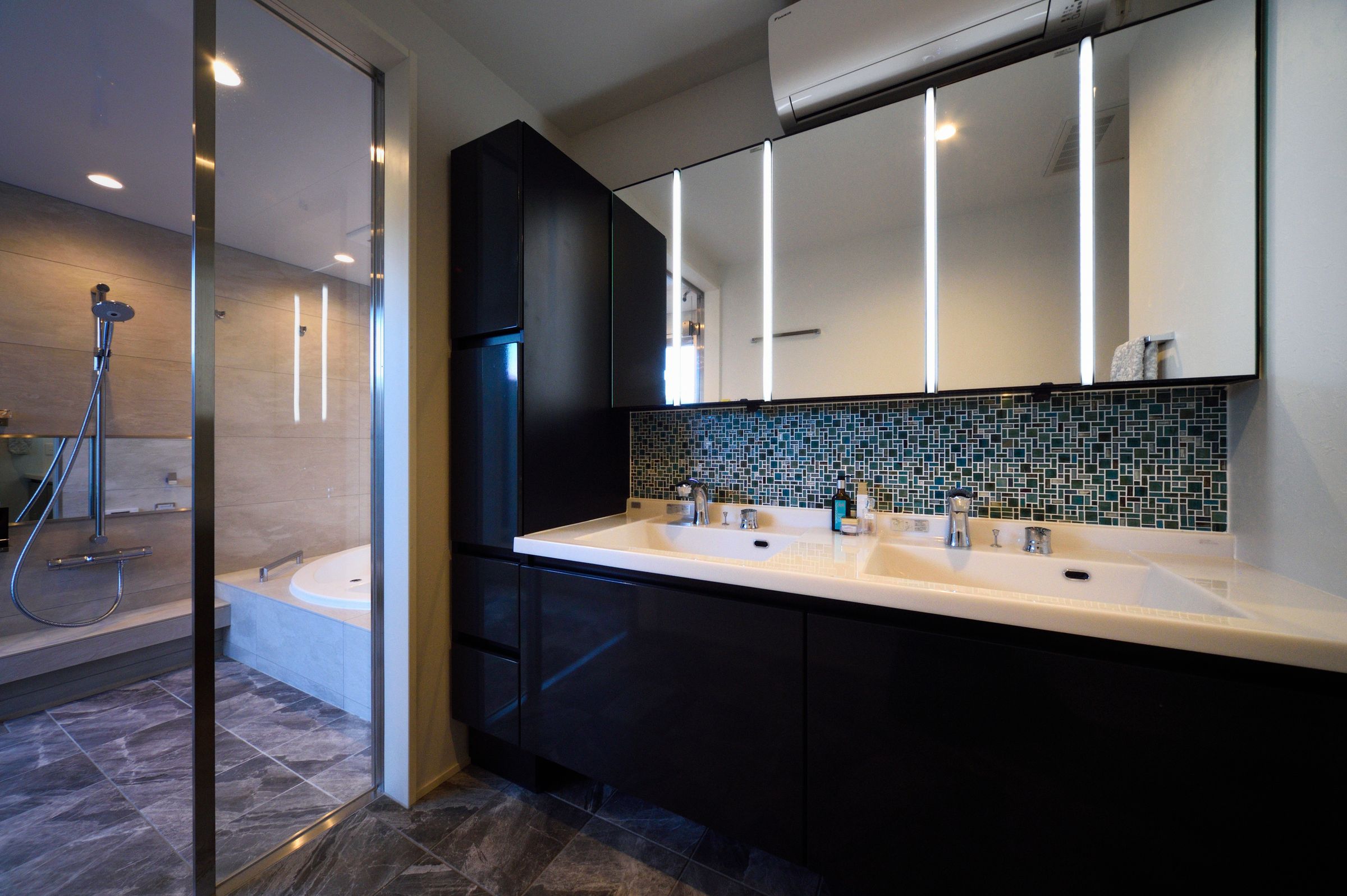 大型ラウンド浴室とWシャワー。浴槽から坪庭を眺める贅沢な空間。高級感を更に際立たせる2ボウル洗面。