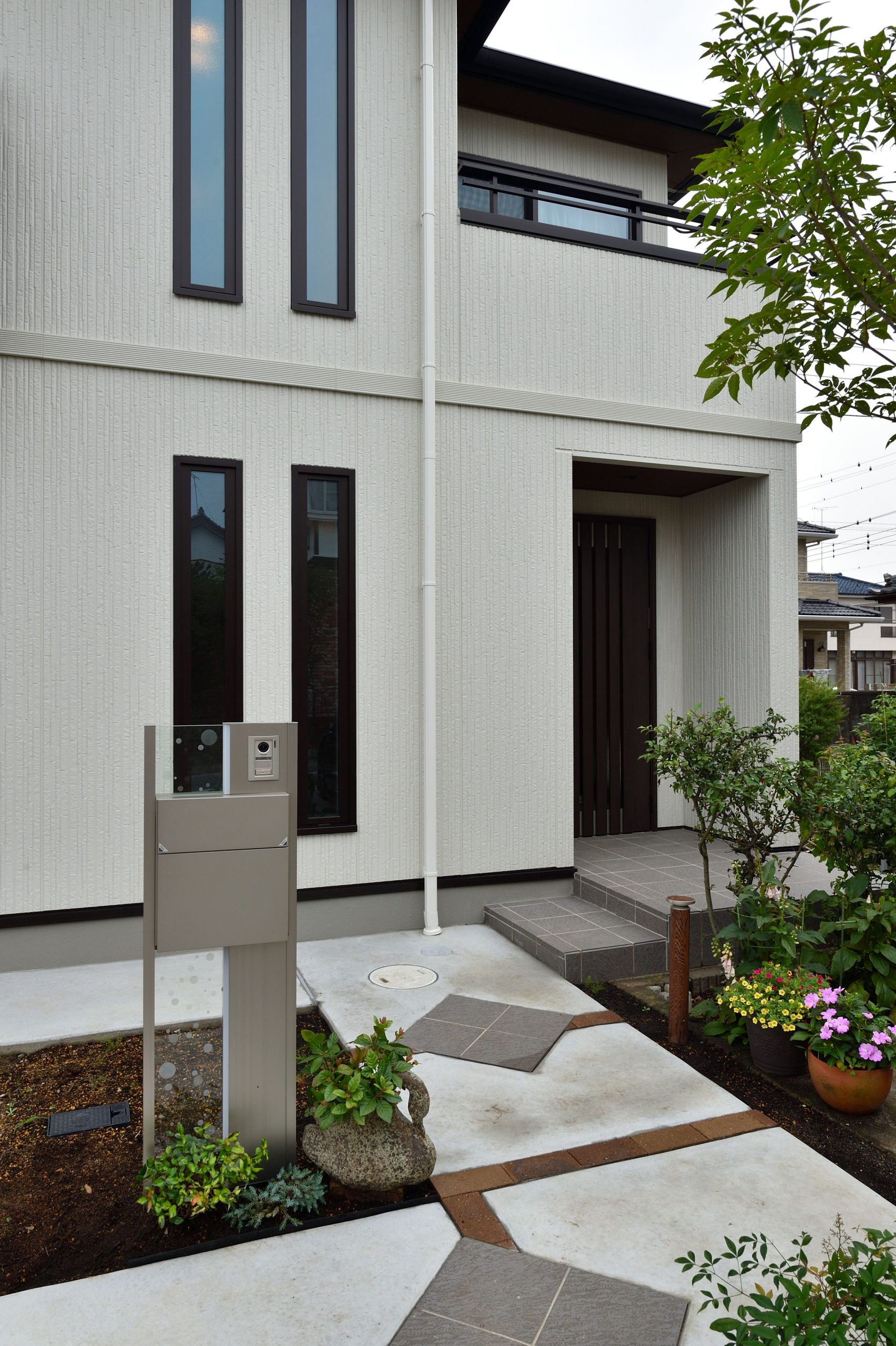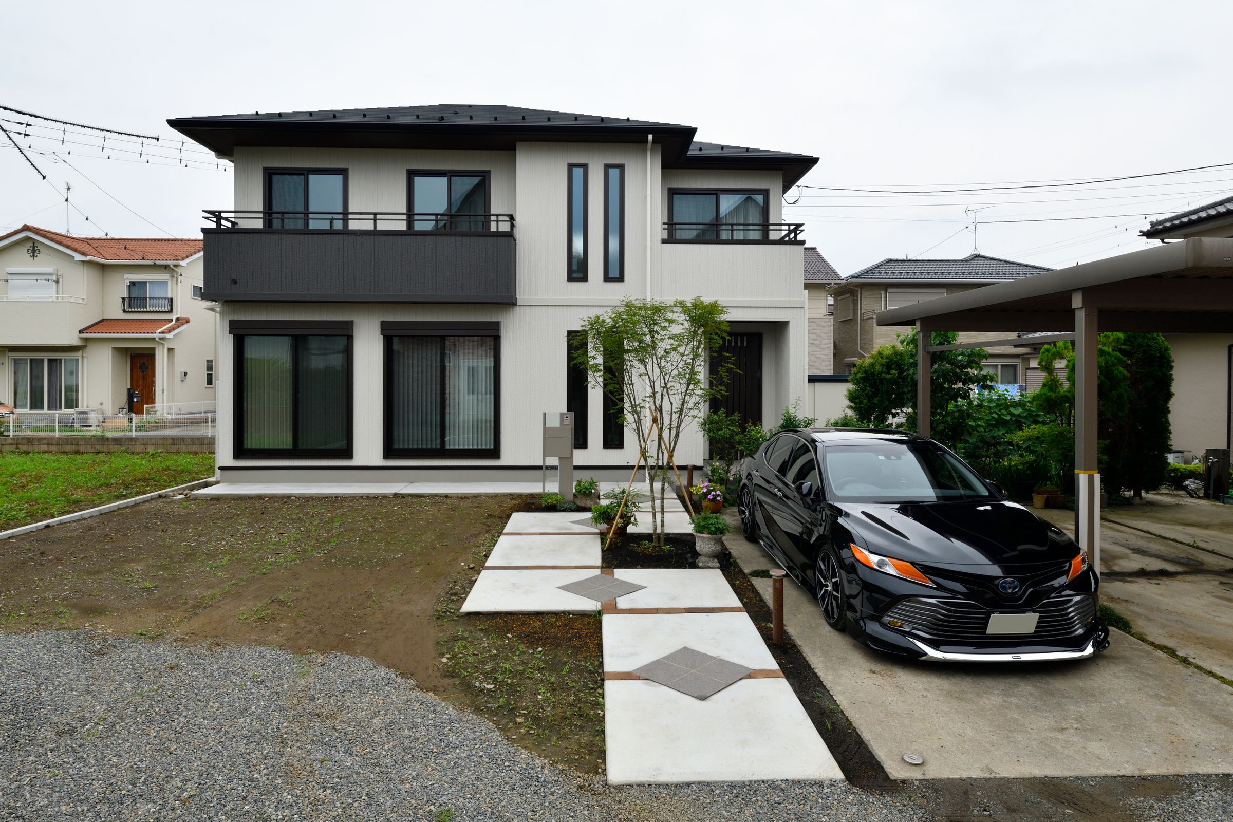 白い外壁とモダンなデザインが調和した住まい