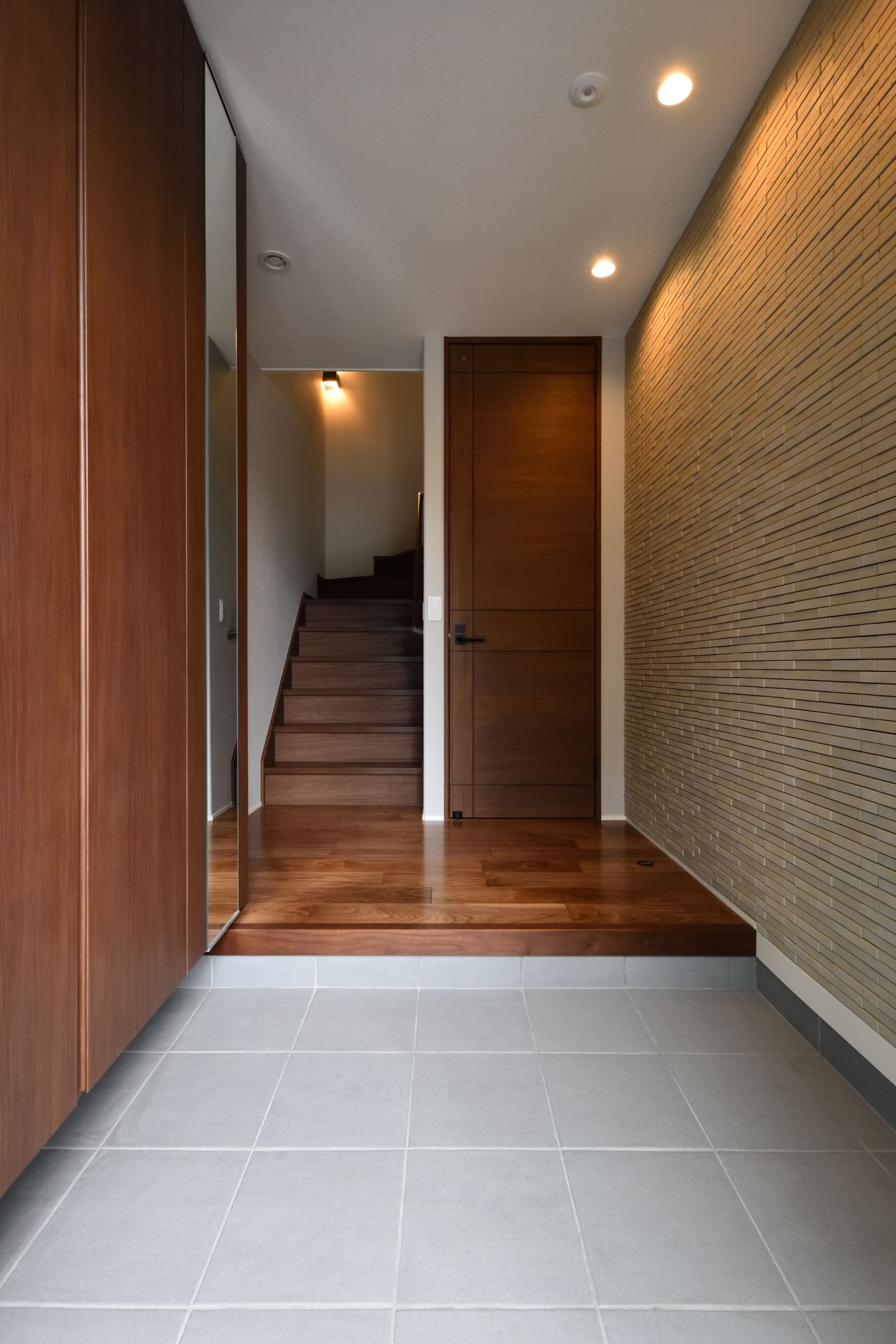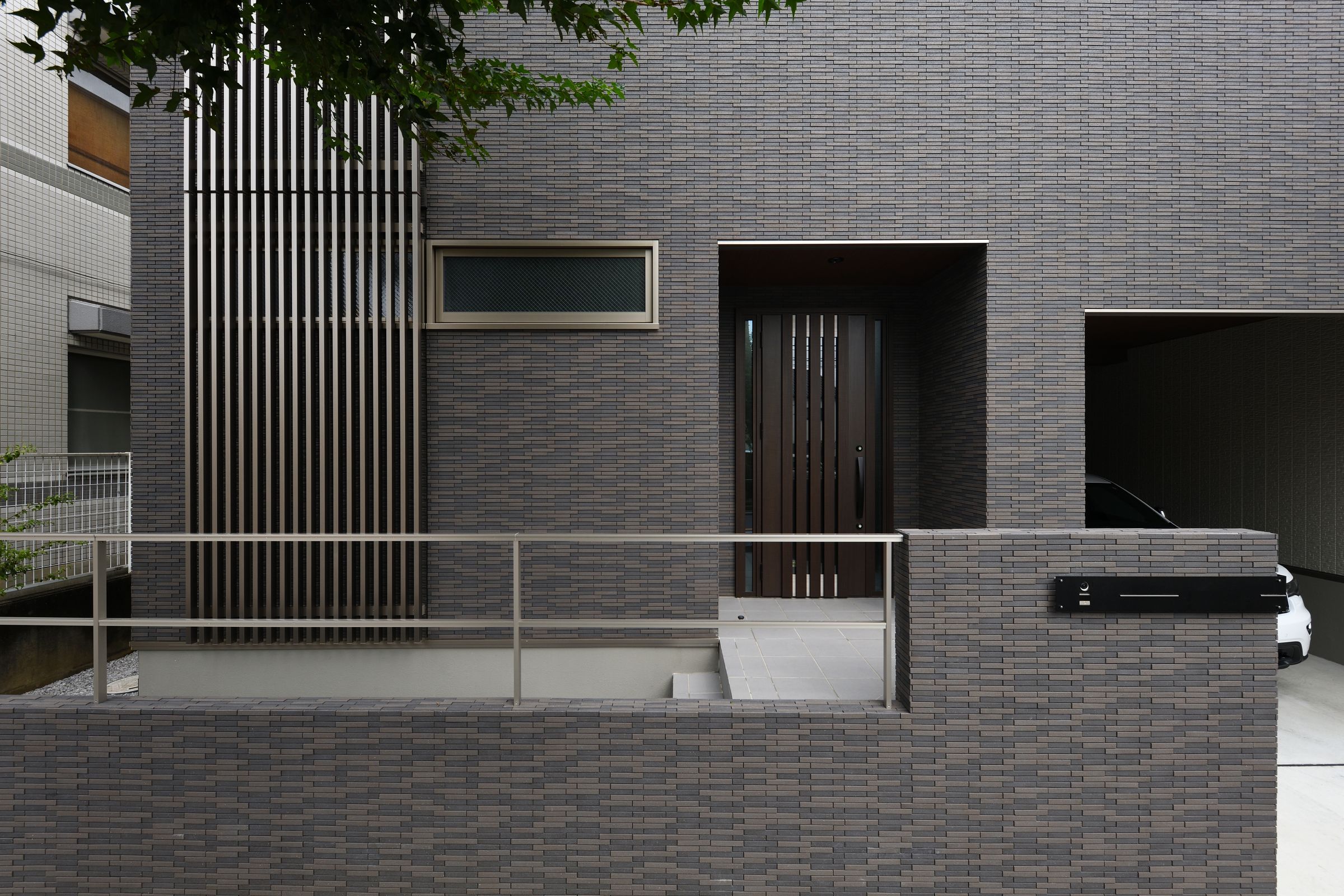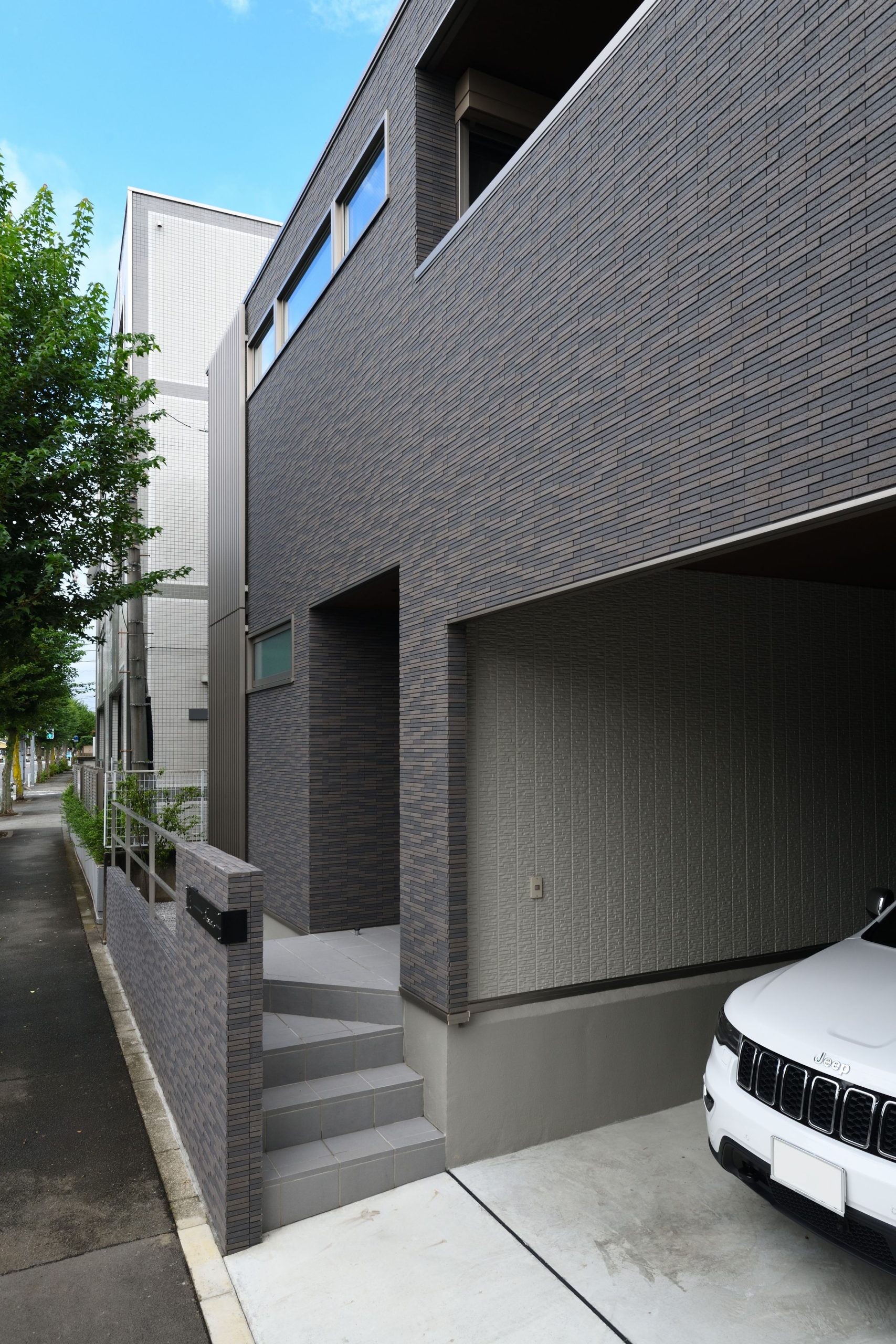 タイル張りの上品でスマートな外観を実現したビルトインガレージハウス。日差しや雨風を凌ぐルーフバルコニーは、快適なアウトドアリビングとして大活躍。