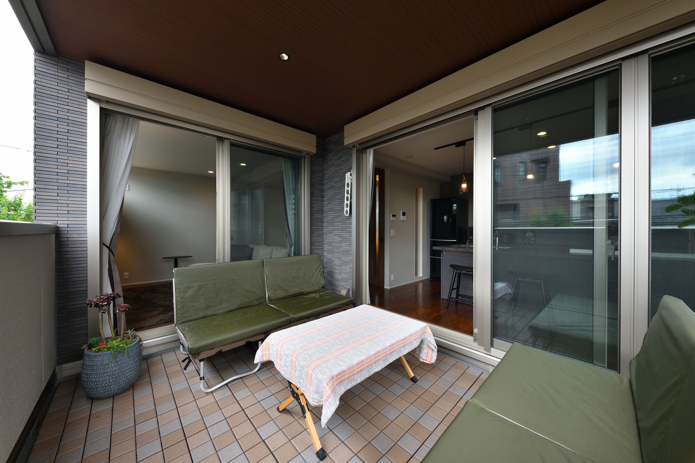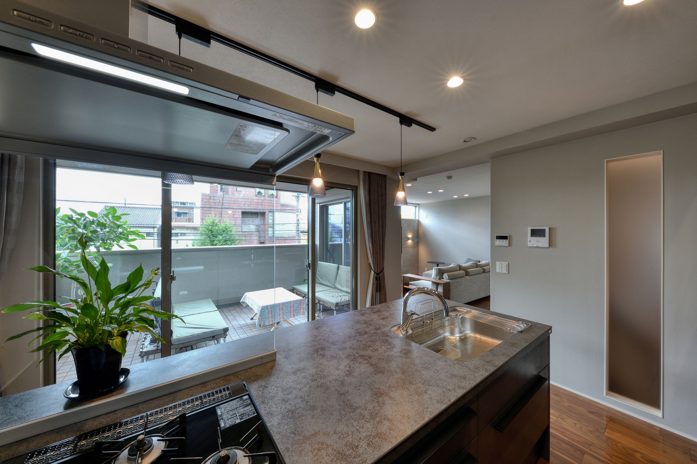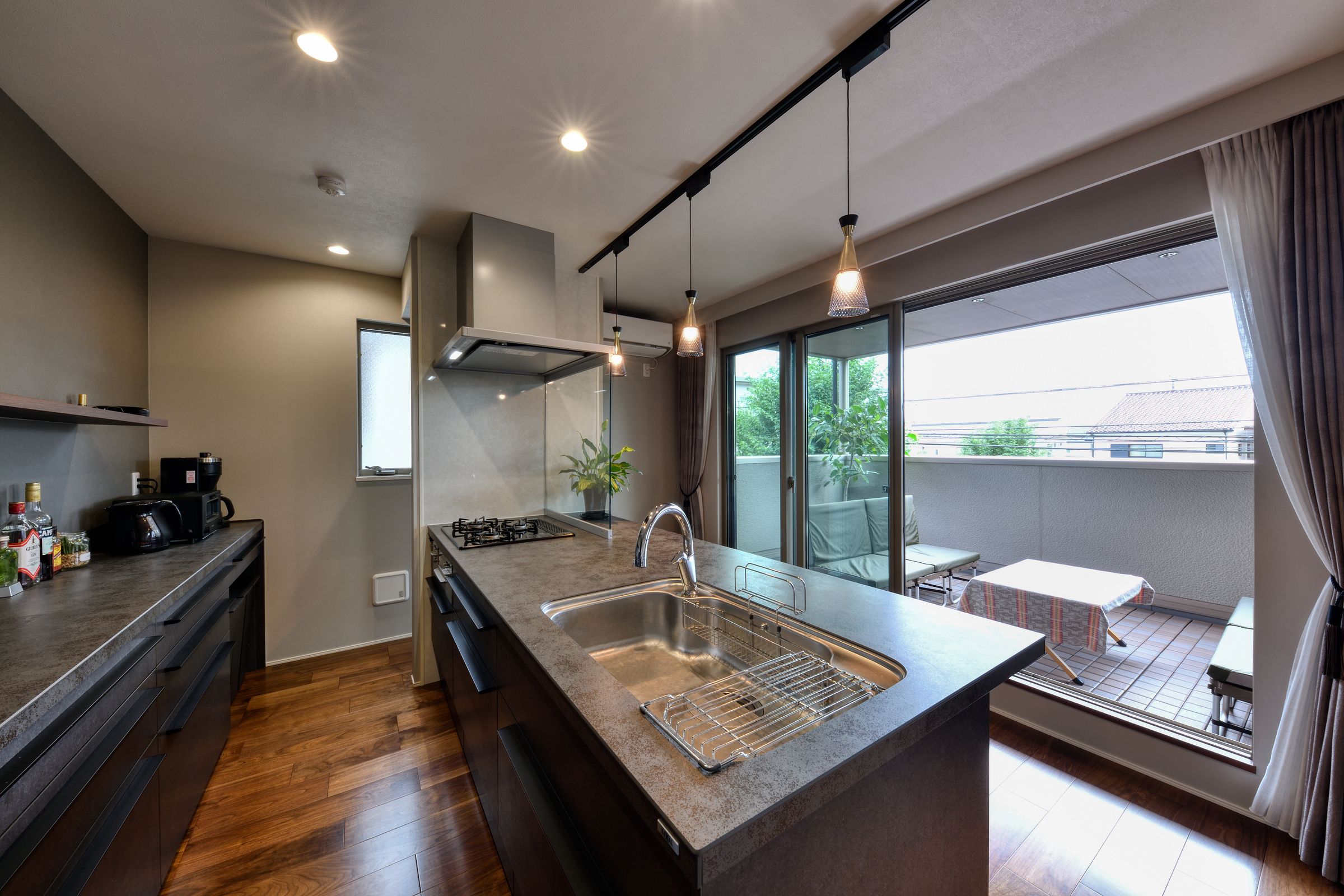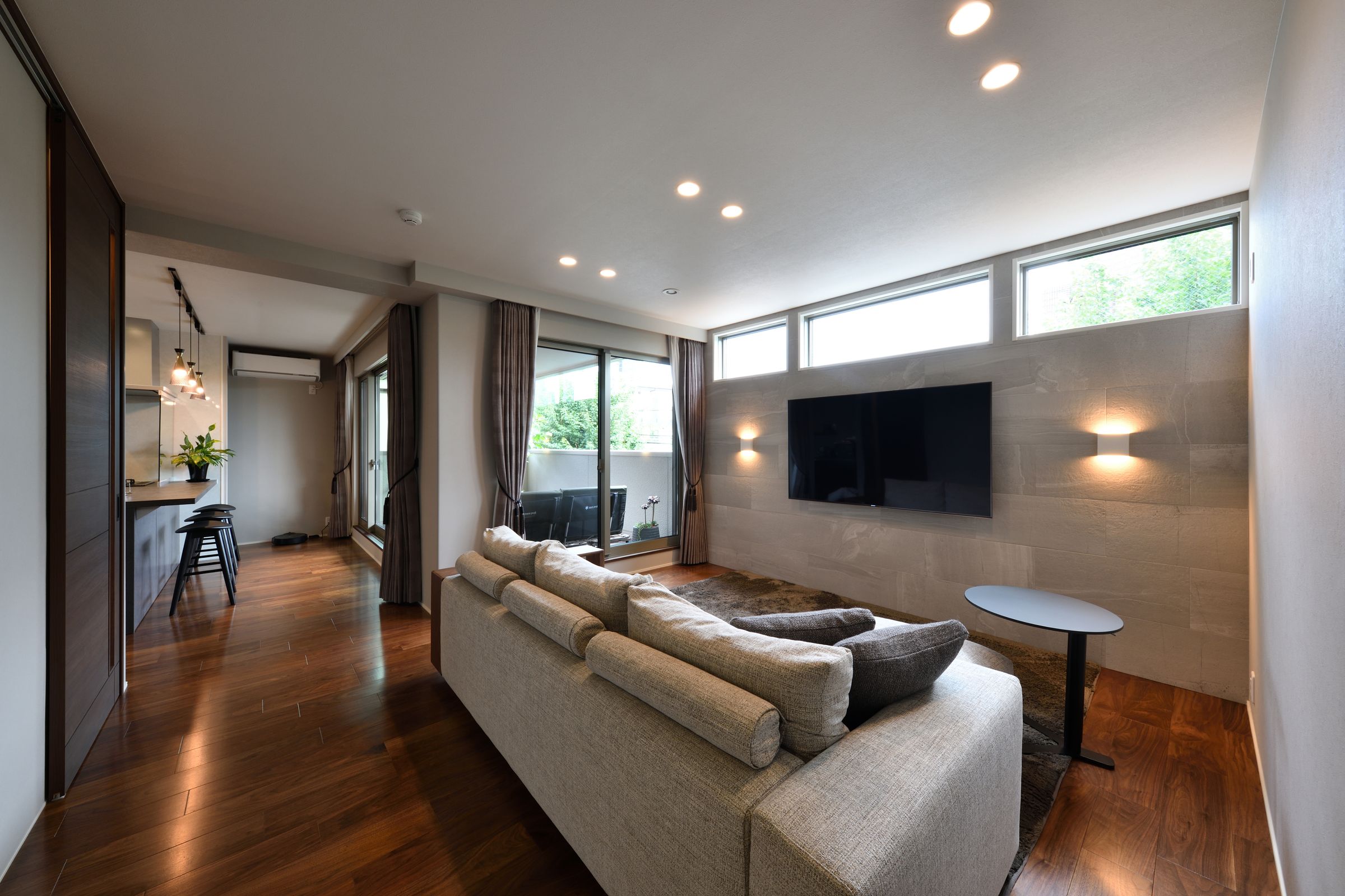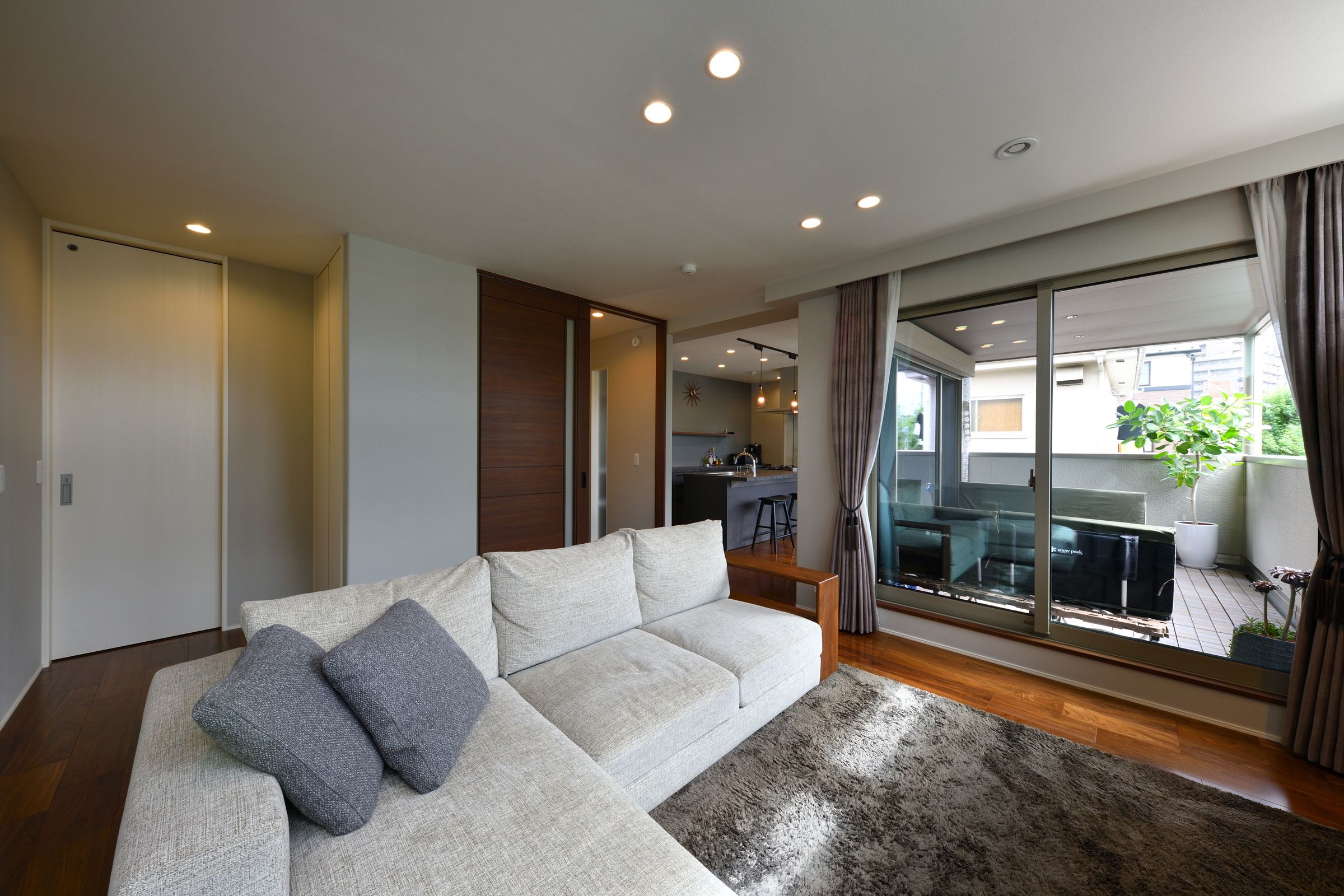 あえてダイニングテーブルは配置しない。天気のいい日には、キャンプ好きのご夫婦がバルコニーで愛犬と共に食事やリラックスタイムを堪能。