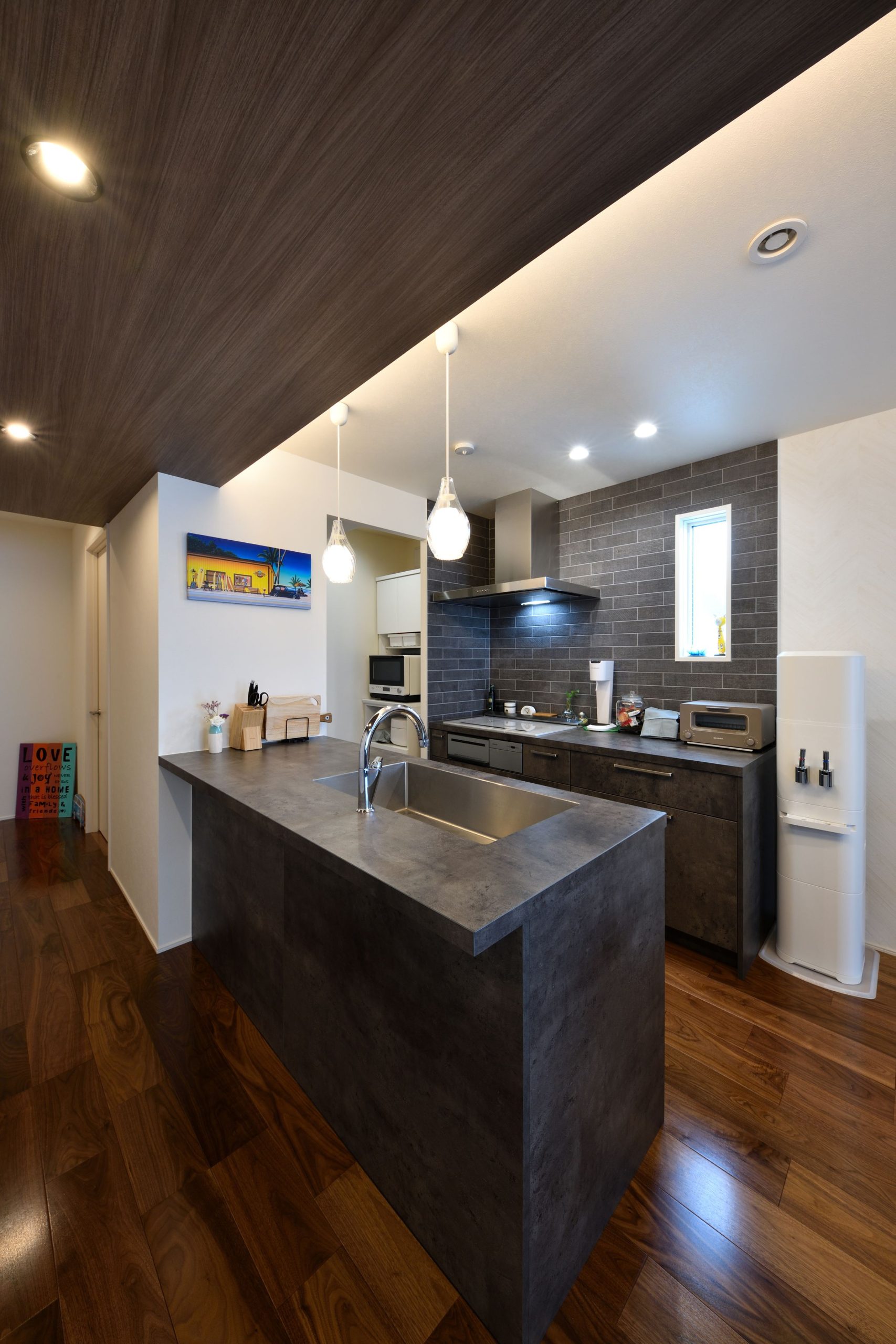 子世帯様2Fリビング。バリの美しい海や空をイメージさせる色使いの大人のリゾートインテリア。テレビボード側一面は、ヘリンボーン柄のベージュクロスで空間に表情をつける。キッチンのグレータイルとのコントラストを効かせ、上品さとオシャレ感をアップ