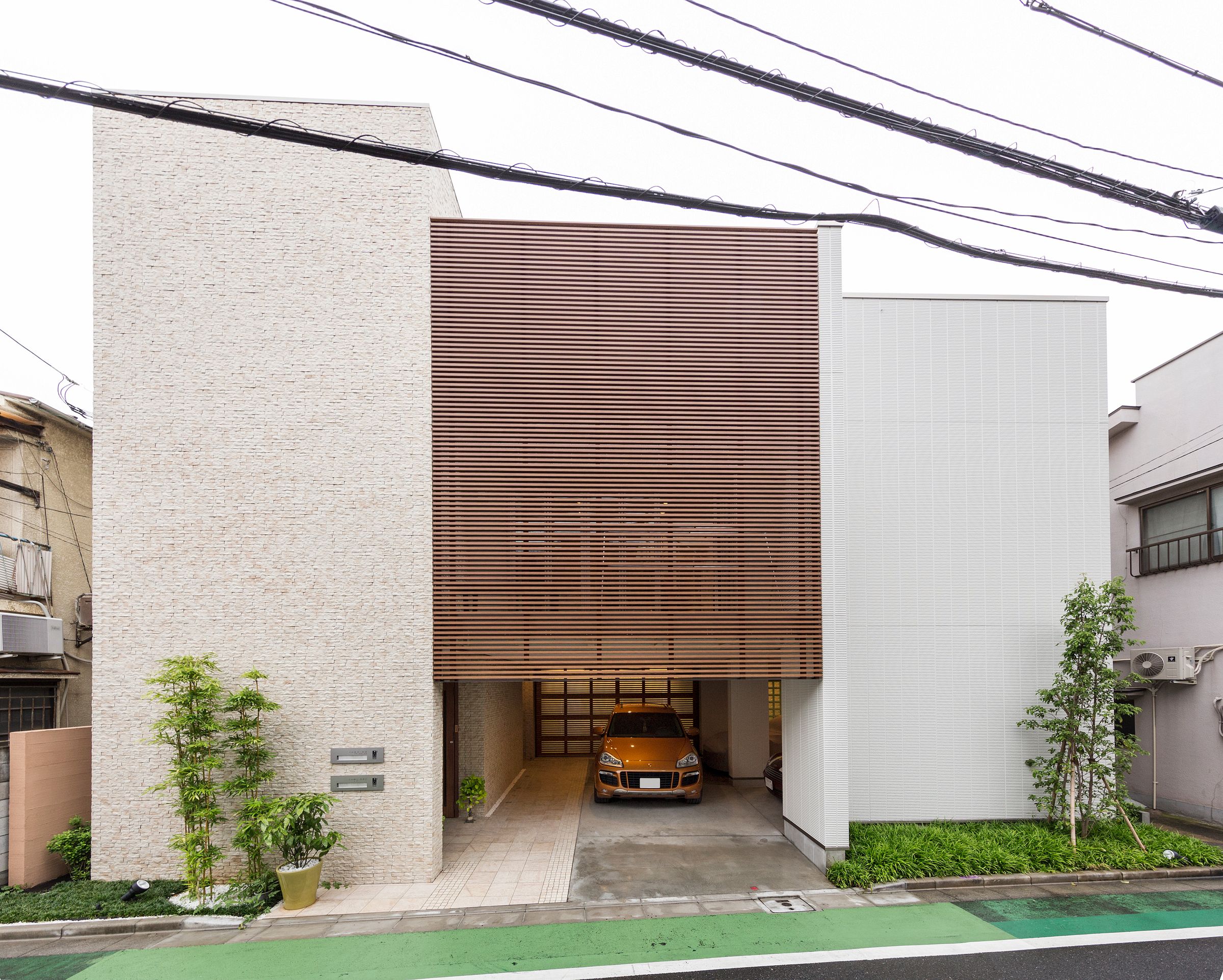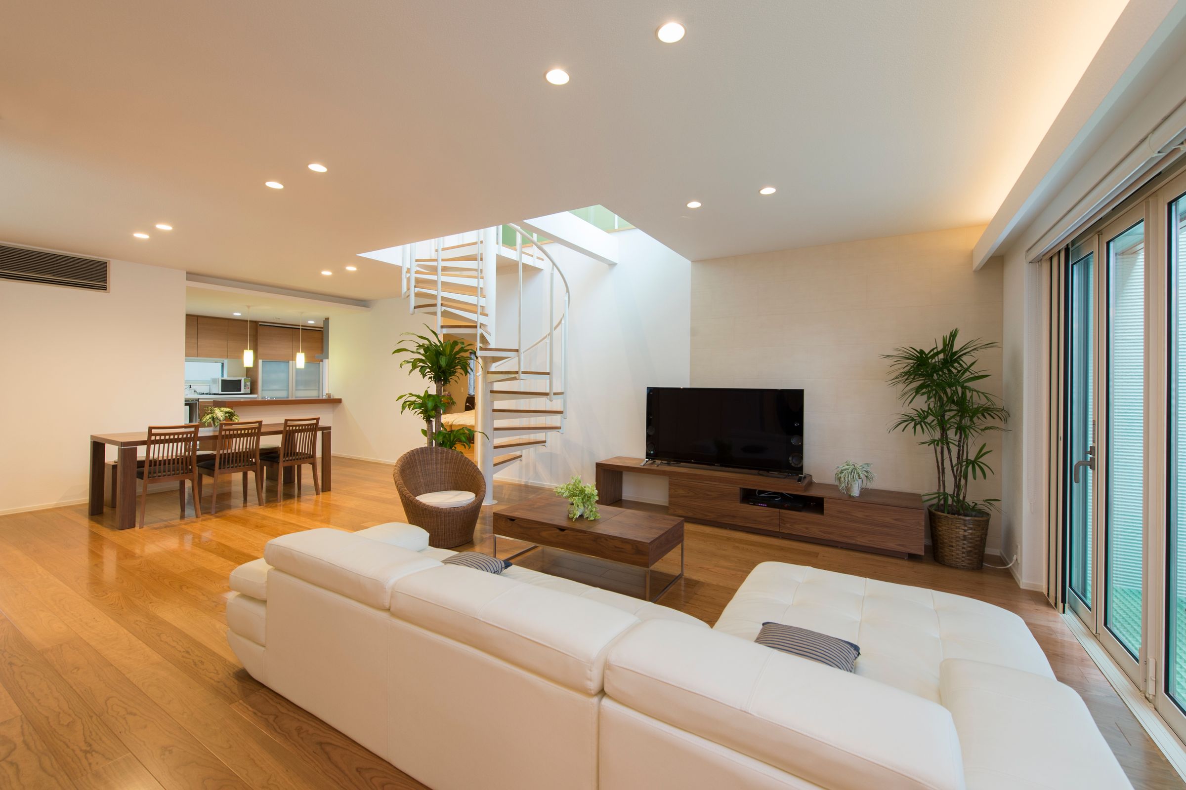 タイル貼りの重厚感と木調ルーバーが特徴のスタイリッシュな二世帯住宅。 ナチュラルカラーを基調にラグジュアリー感を演出。 2階から3階への「つながり」を大切にしたリビングイン階段。 らせん階段を通して家族の様子がわかるのがうれしい。