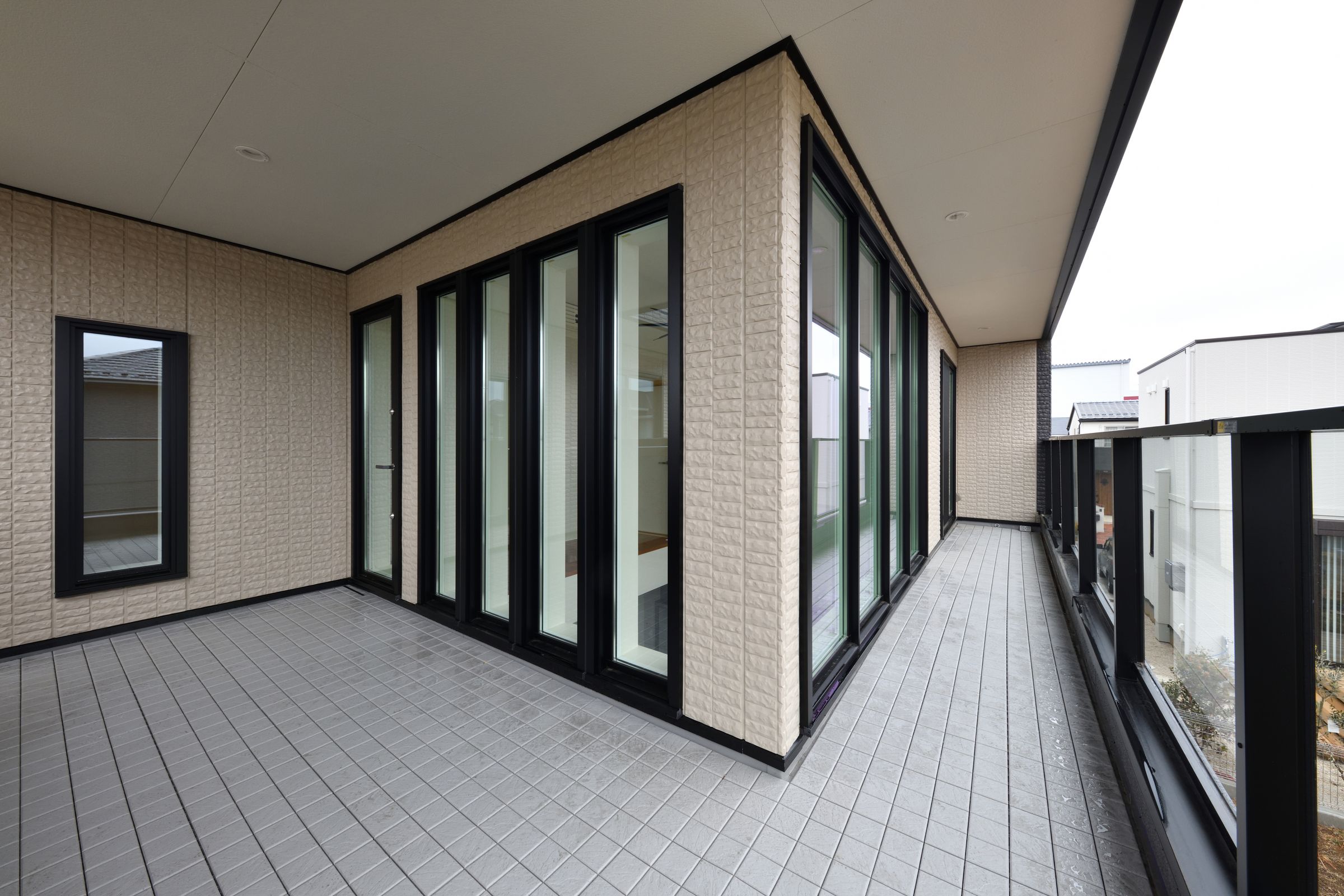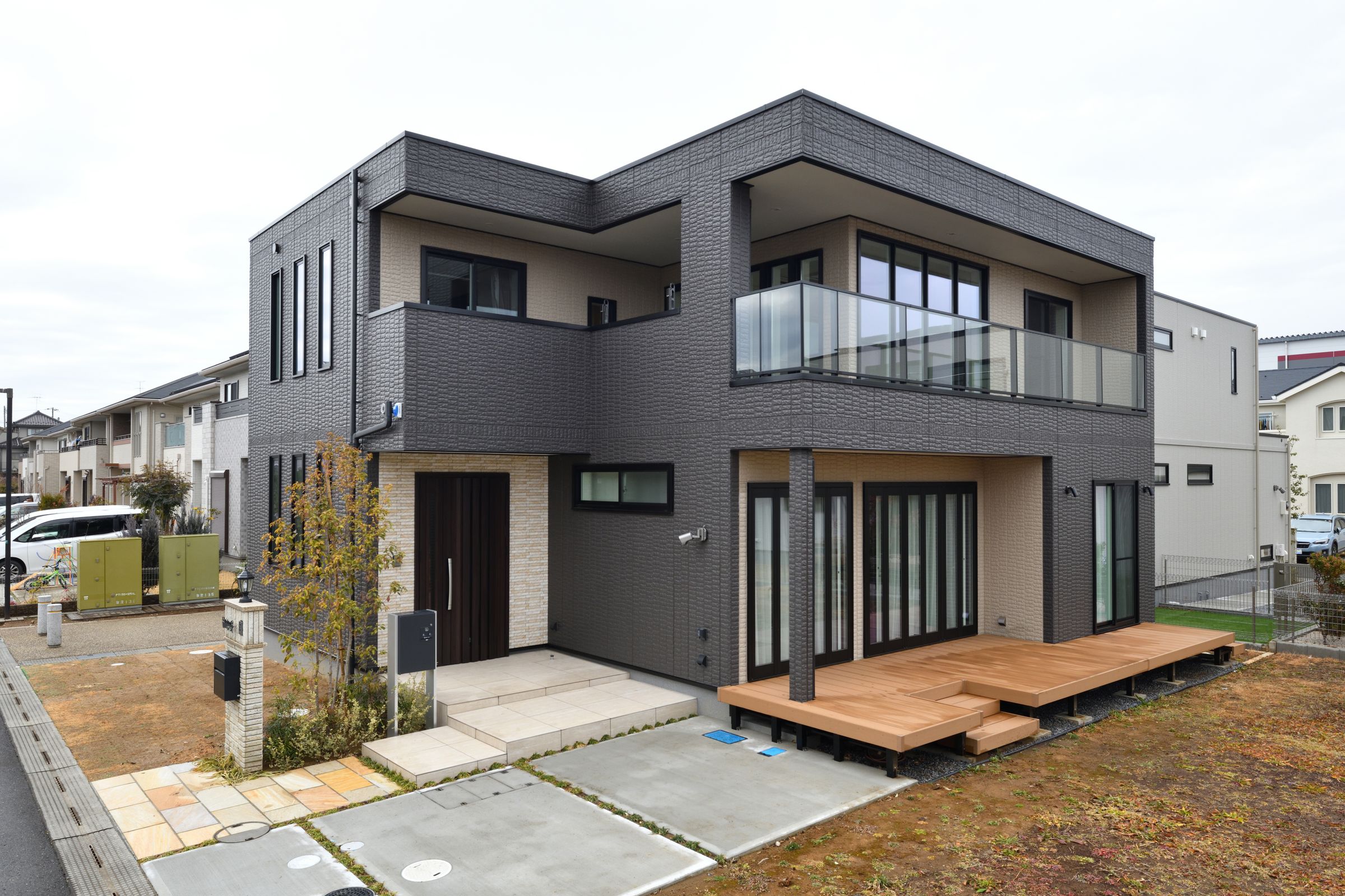 家の印象を決めるエントランス廻りは、錆石の風合いで趣のあるタイル貼りに。建物に沿うように設けたバルコニーのコーナー部は光や風を通しながらプライベートバルコニーとしても活用できる。