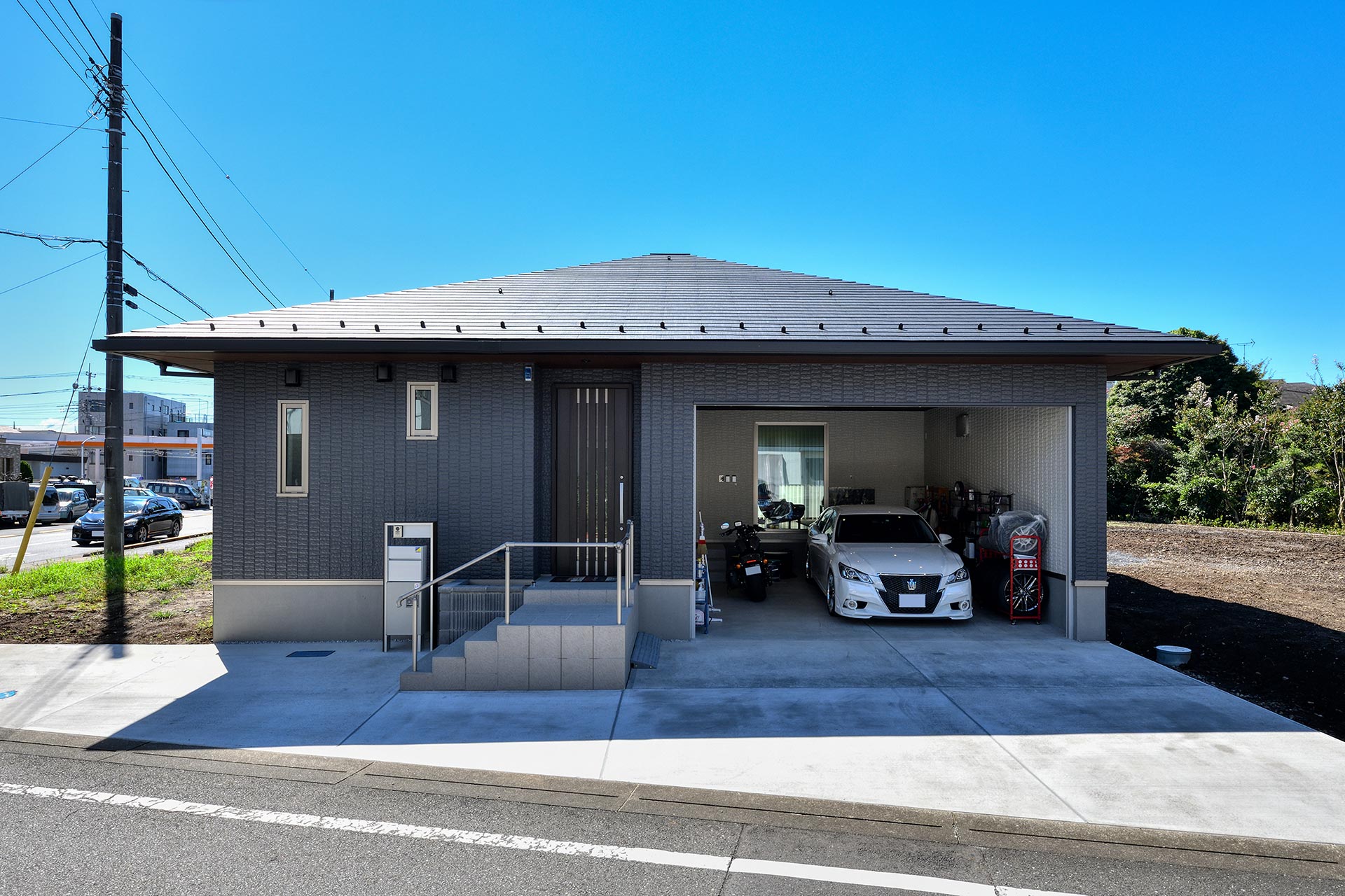 室内から常に車やバイクを眺める事ができるインナーガレージ。玄関ホールからもアクセスでき、好きな時に作業ができることで日々満ち足りた気分に