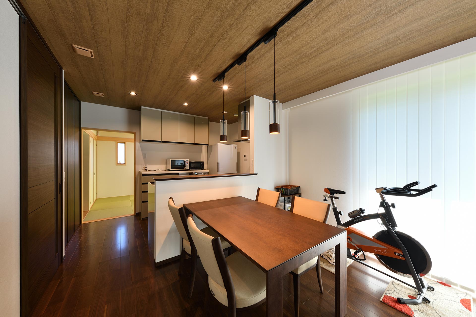 リビングにいながら愛車が眺められるよう開口部を設け、また南面に設けた幅約3mの大開口の掃き出し窓からは芝生の庭が広がる。ダーク色のフローリングや木目の天井など、木の風合いを活かした落ち着きを感じさせる大人のインテリア