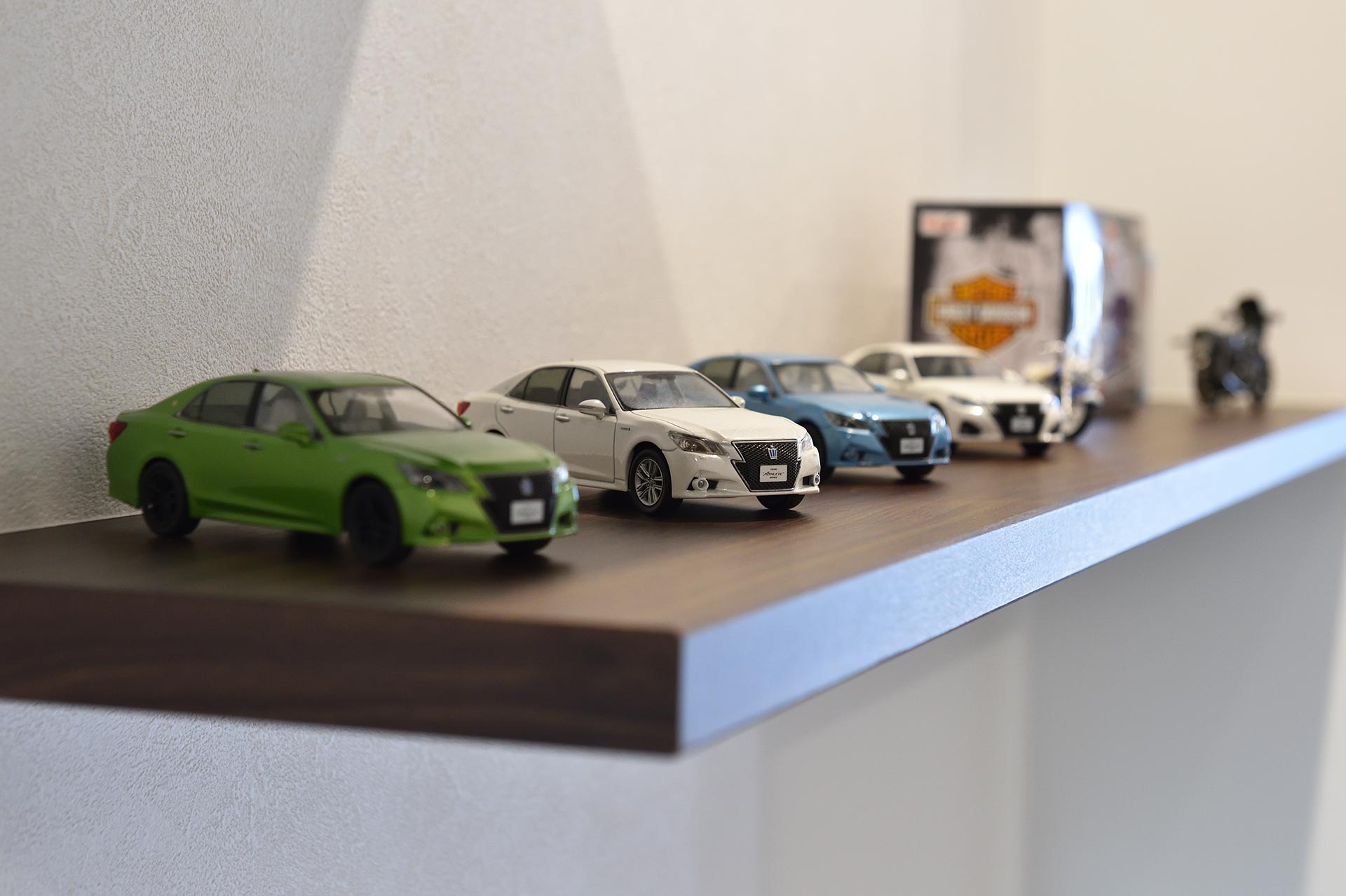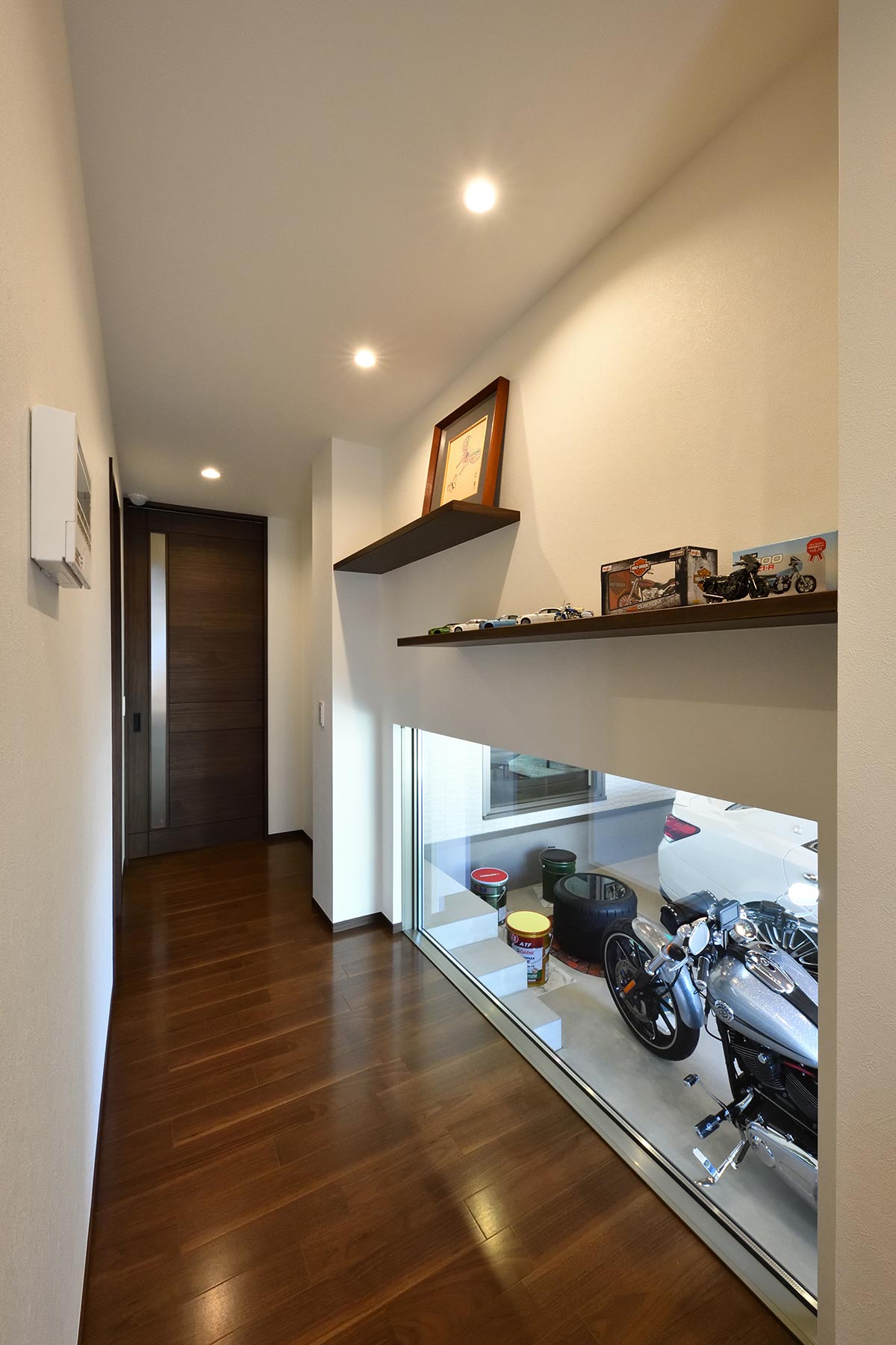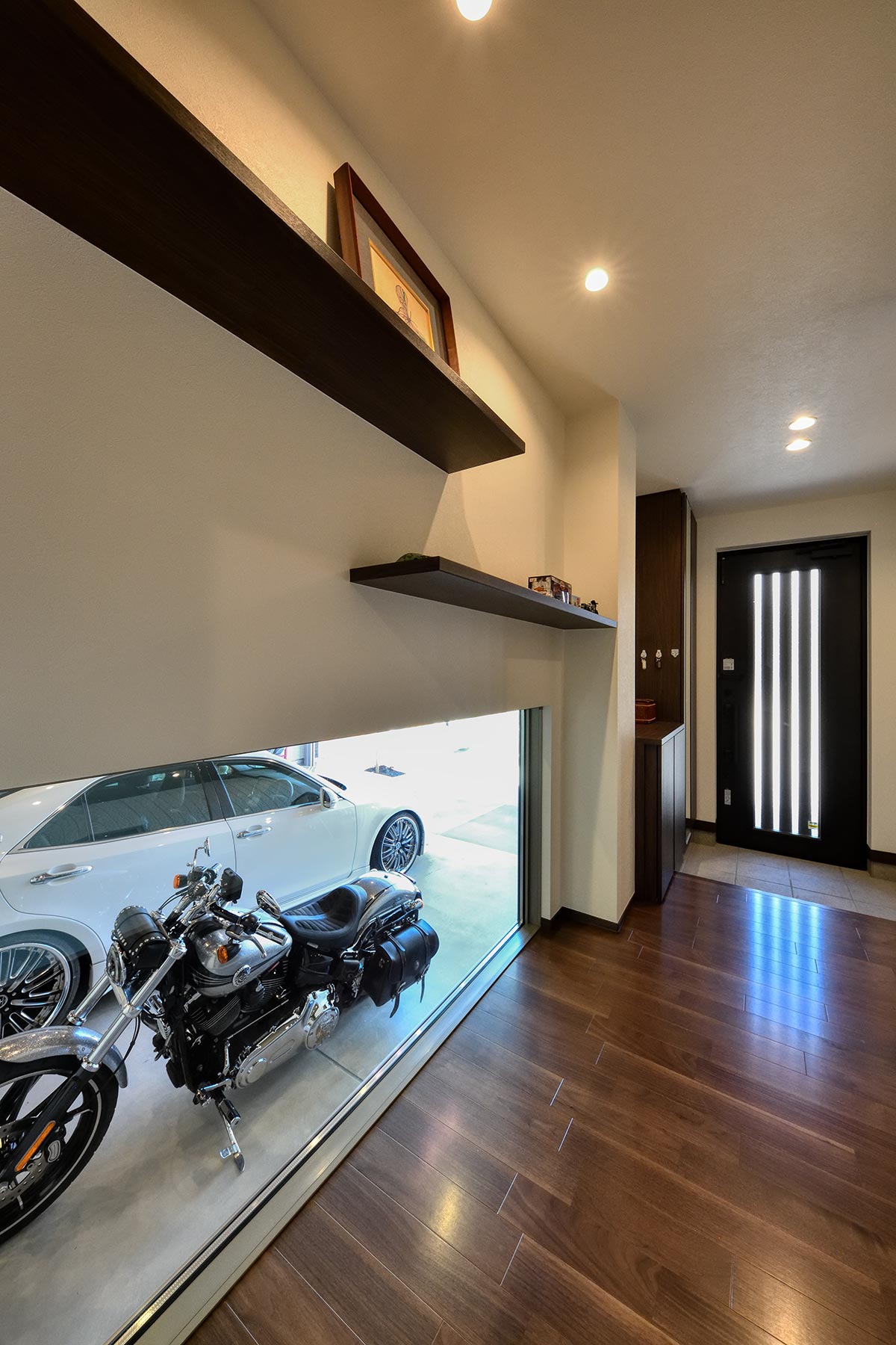 ガレージ内の照明だけをONにしてショールームのような演出も可能。愛車の楽しみ方は無限大。玄関ホールの飾り棚は、お気に入りのコレクションスペースに