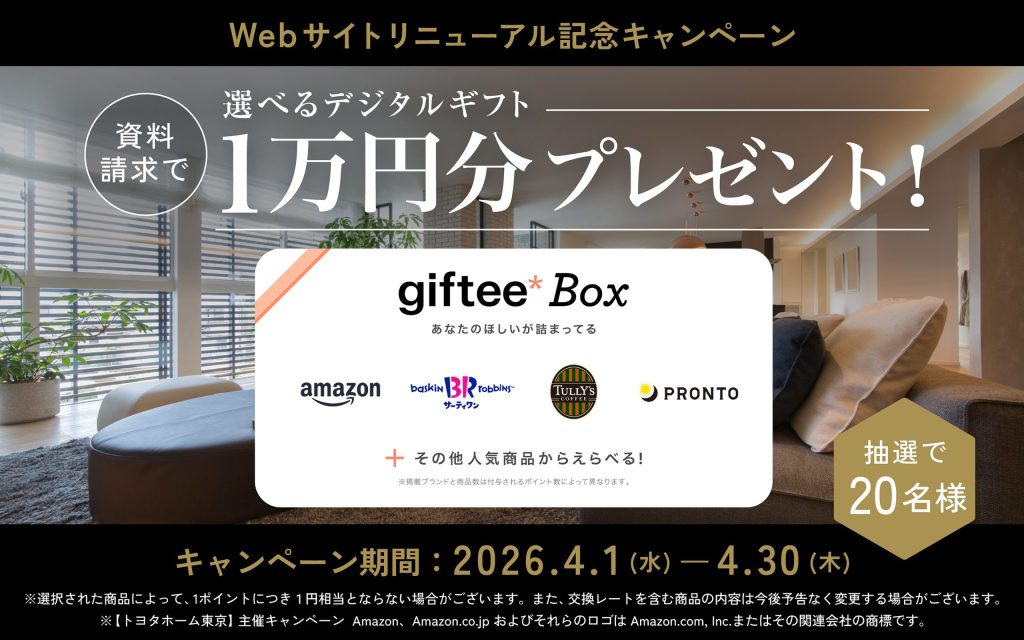 期間限定で、トヨタホーム東京にはじめて資料請求いただいた方の中から、抽選でデジタルギフトが当たる
