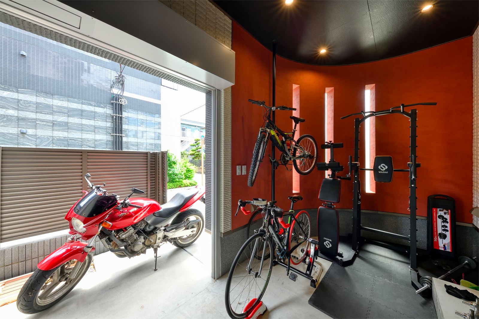 親子二世帯が暮らすこちらの住宅には、バイクや自転車を駐車できるインナーガレージがあります。ガレージと収納スペースが出入り口でつながっており、生活動線が確保されています。住宅内にプライベートジムを設けるなど、多彩な趣味を満喫できる暮らしを実現しました。