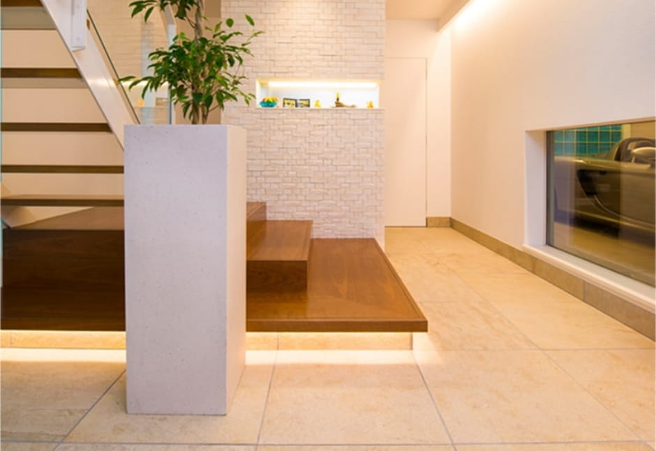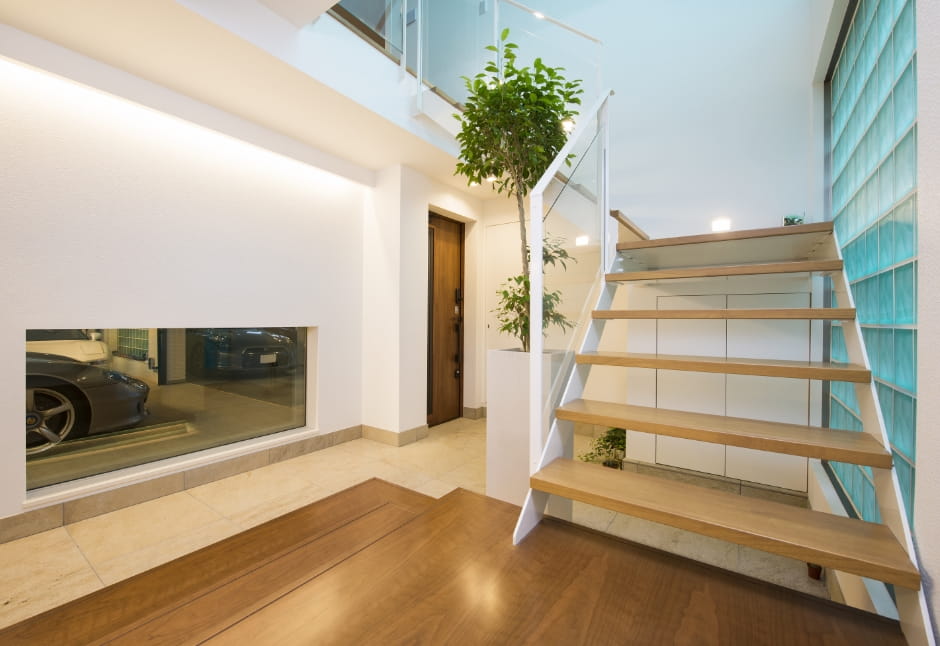 A様のこだわりがつまった大空間は、高性能と自由度を兼ねそなえたトヨタホーム東京の鉄骨住宅だからこそ実現しました。ガレージに隣接する1階の個室や、エントランスに設けたガラスドアから、いつでも愛車を眺められます。日常のなかで車とともに暮らす歓びを実感できる住まいとなっています。