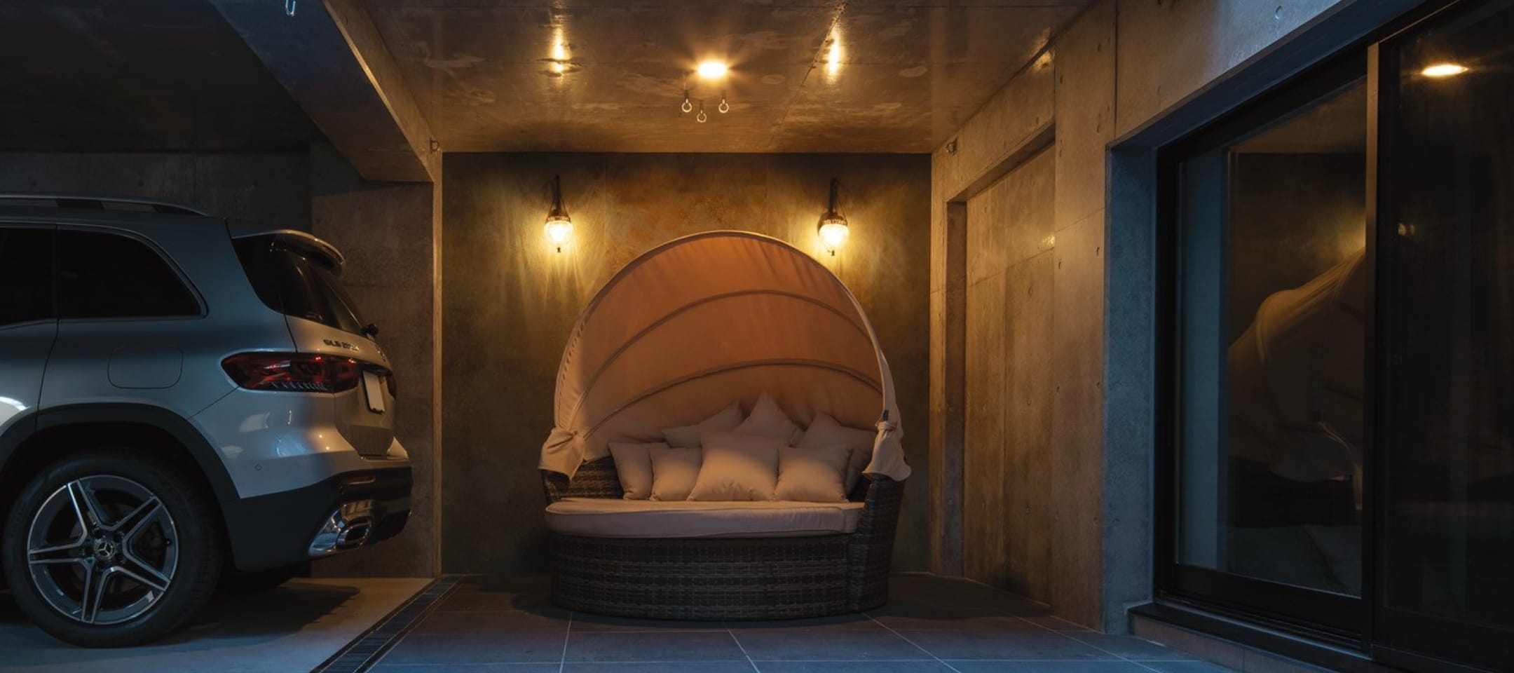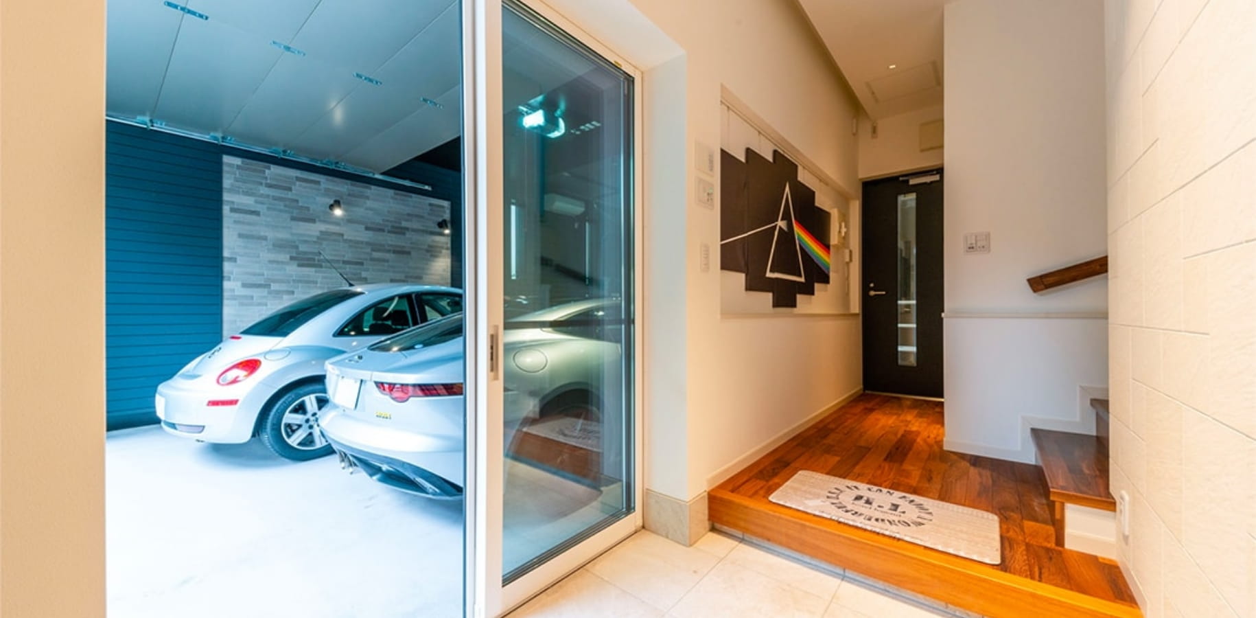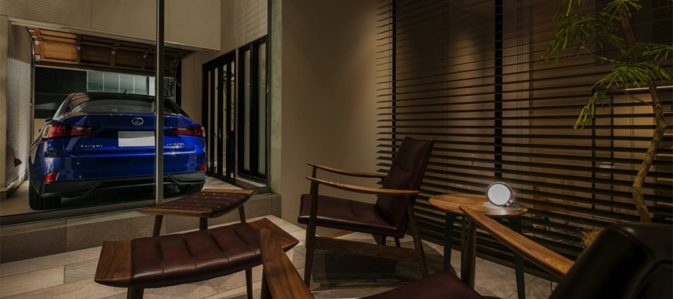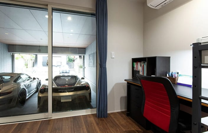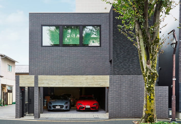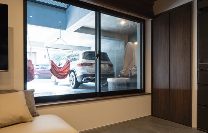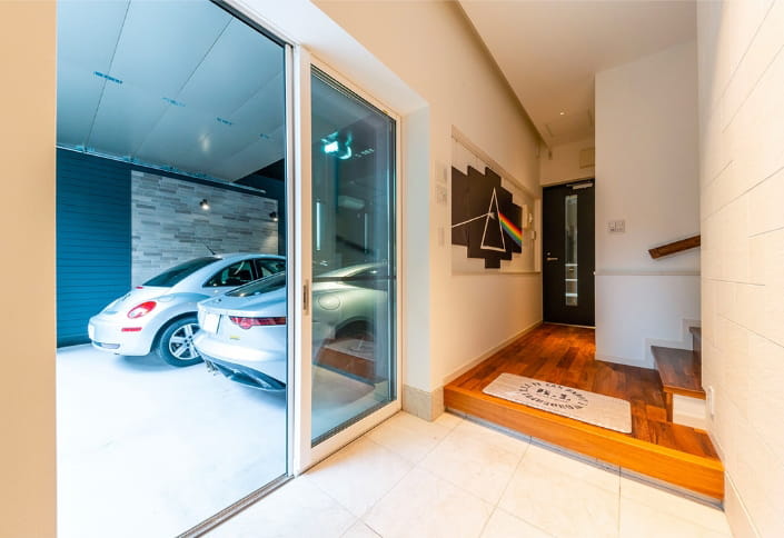 それぞれの世帯が快適に過ごせることに加えてK様が重視したのが、インナーガレージです。所有する5台の車を格納し、ご自身が愛車を眺めながらくつろぐことができるソファスペースを確保。床の目地のつながりまでこだわってデザインした空間は、まるでショールームのような雰囲気に仕上がっています。
